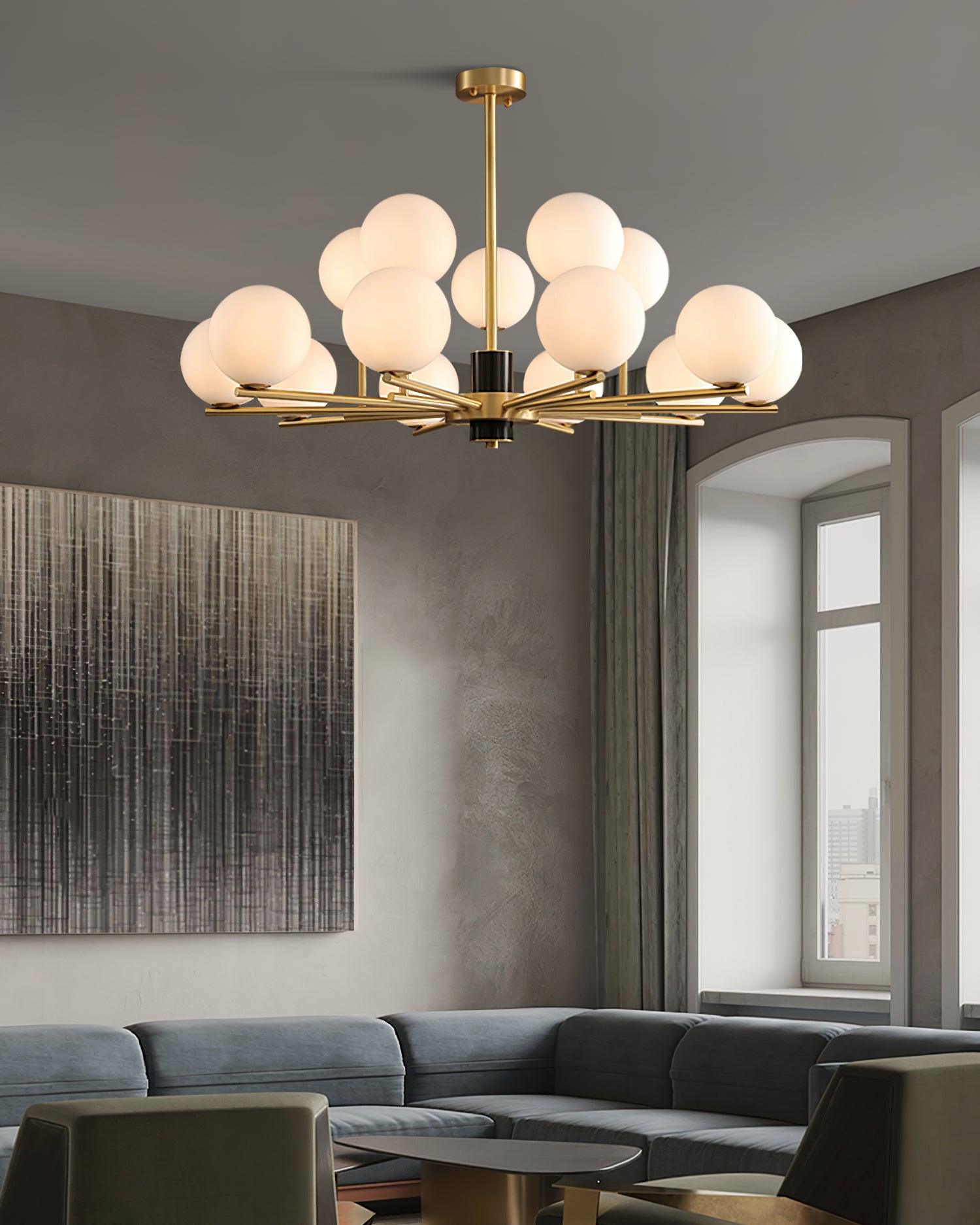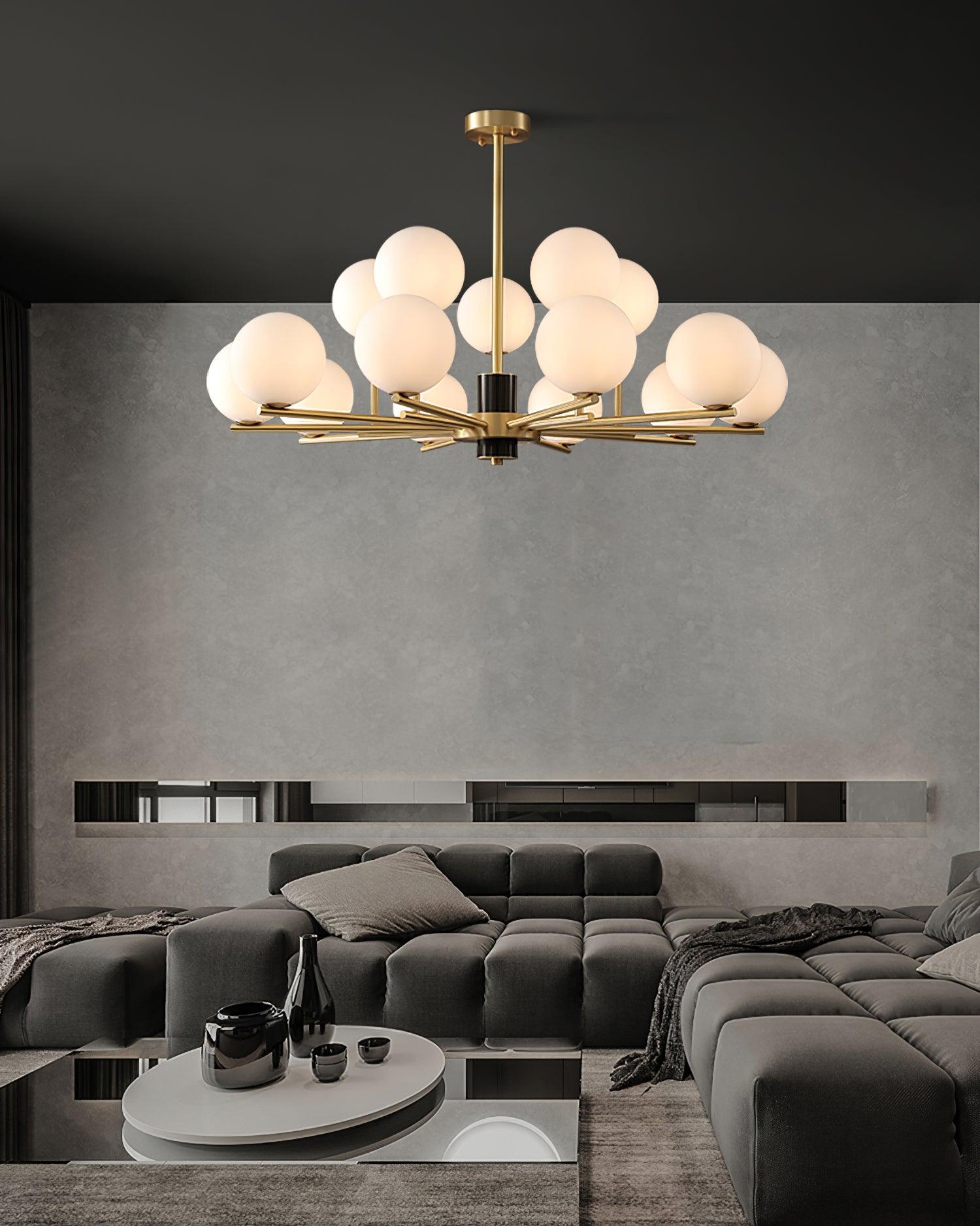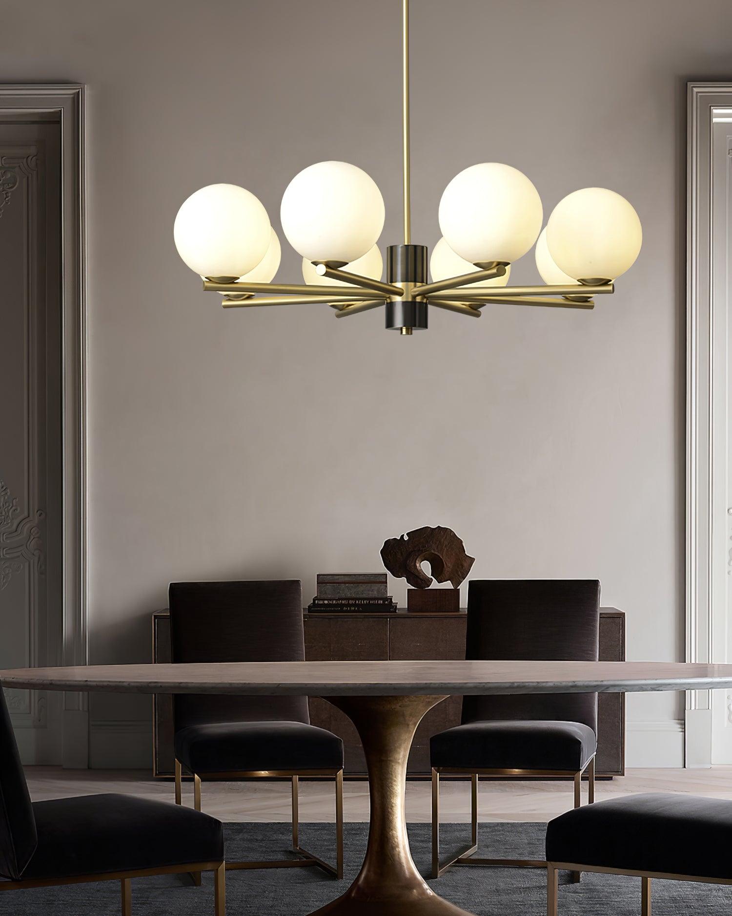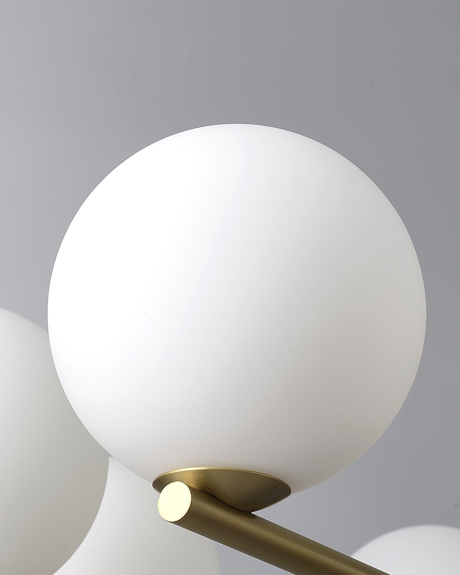 The Marais Chandelier provides a gentle. ambient light and creates a tranquil atmosphere. Its white glass spheres hang gracefully. giving it an elegant and refined look that adds a touch of minimalism to any home. Enjoy its calming presence and effervescent beauty.