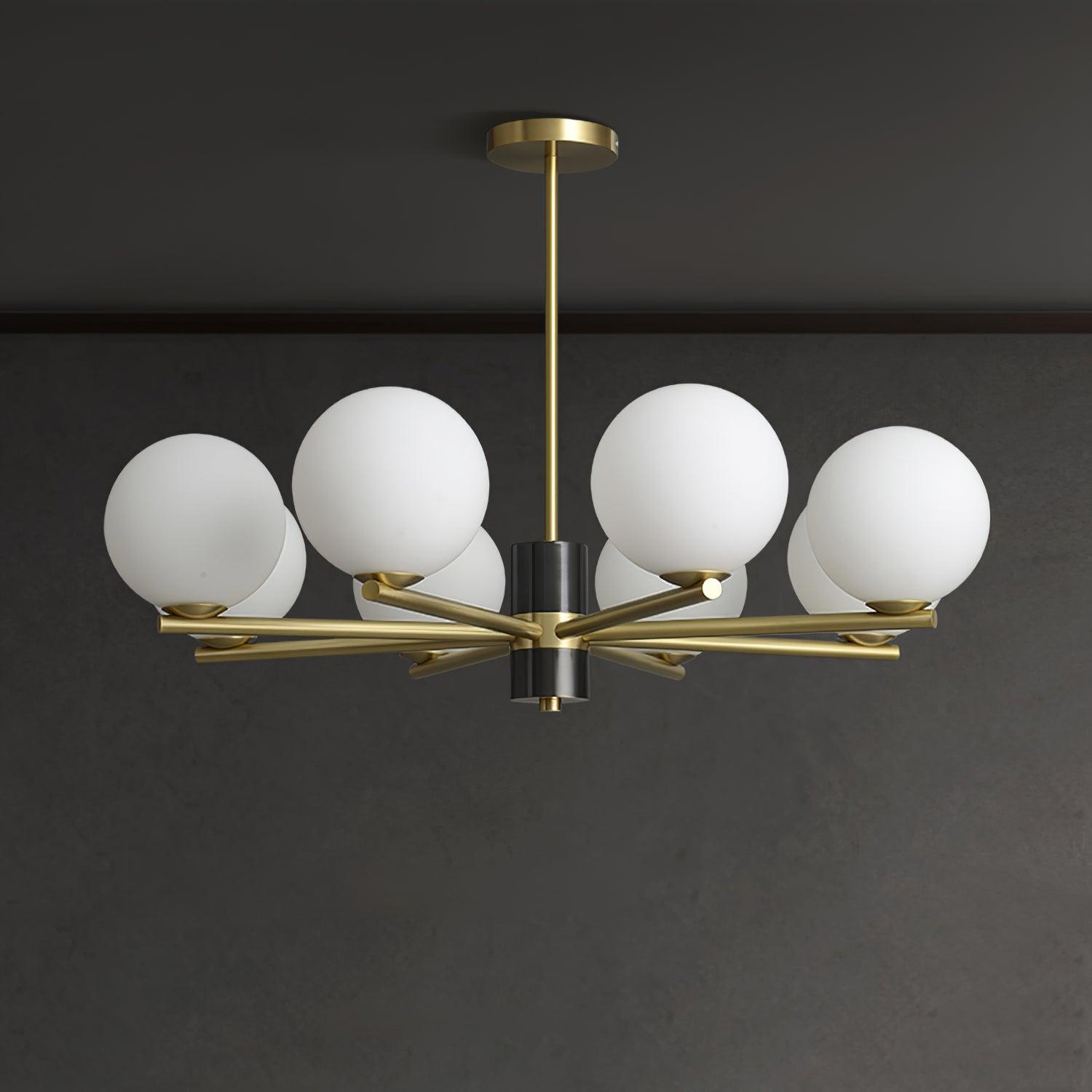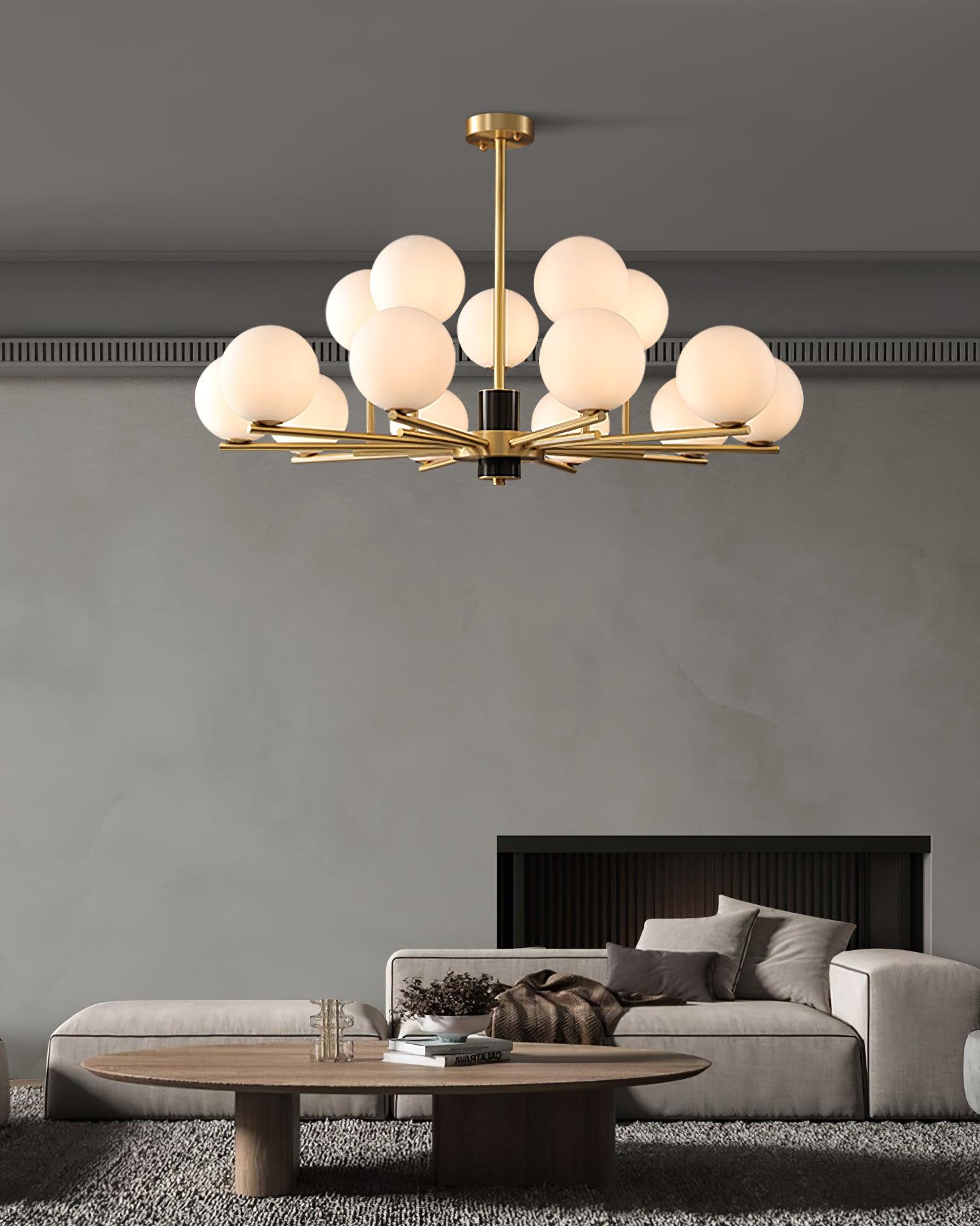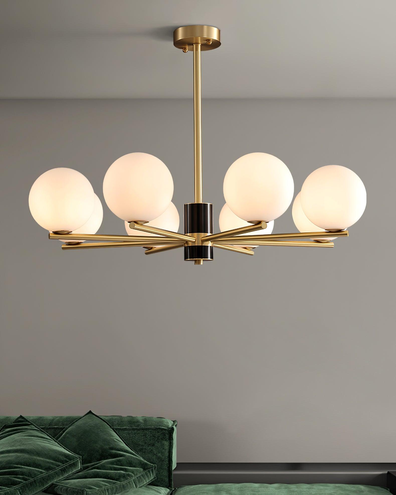 The Marais Chandelier provides a gentle. ambient light and creates a tranquil atmosphere. Its white glass spheres hang gracefully. giving it an elegant and refined look that adds a touch of minimalism to any home. Enjoy its calming presence and effervescent beauty.