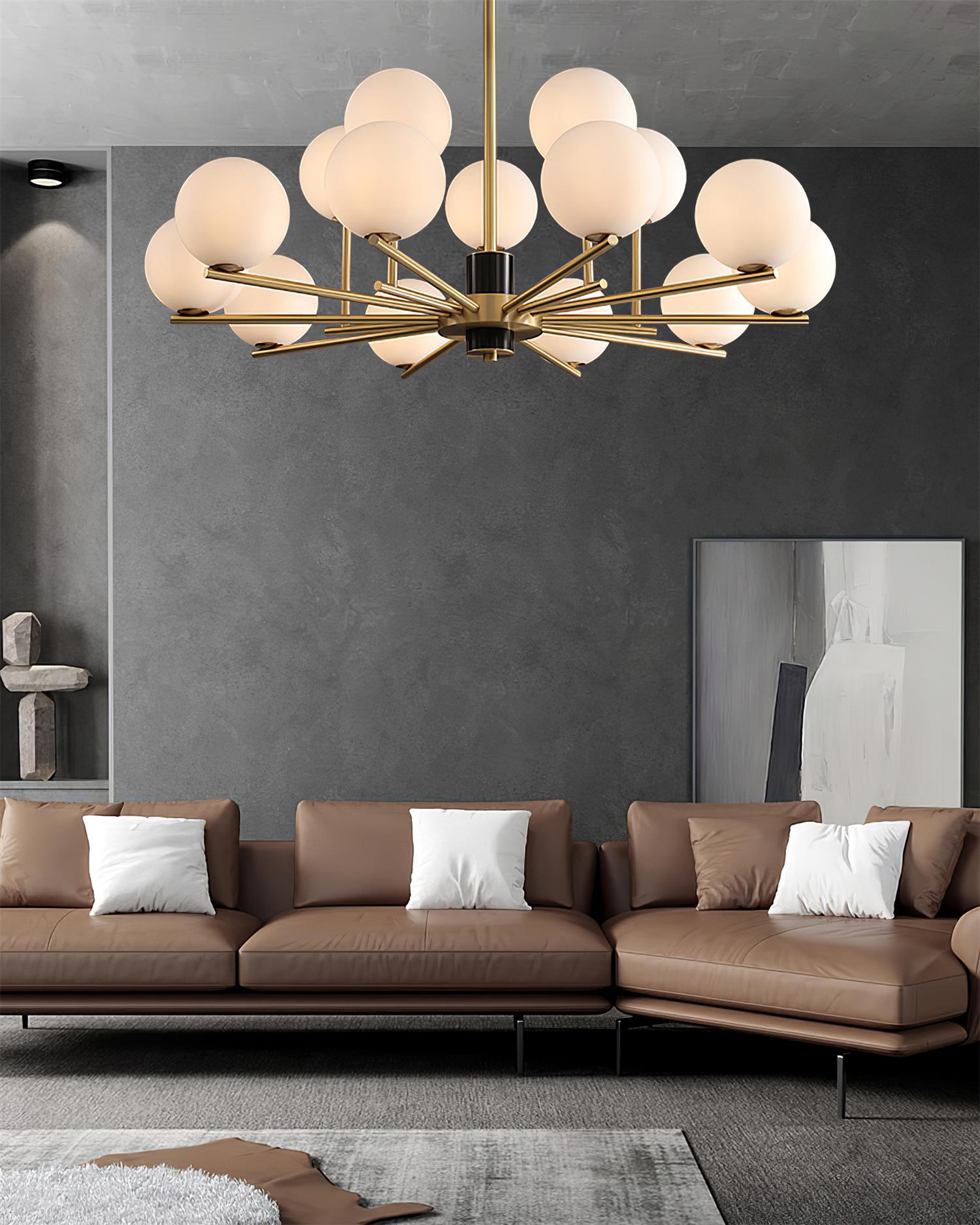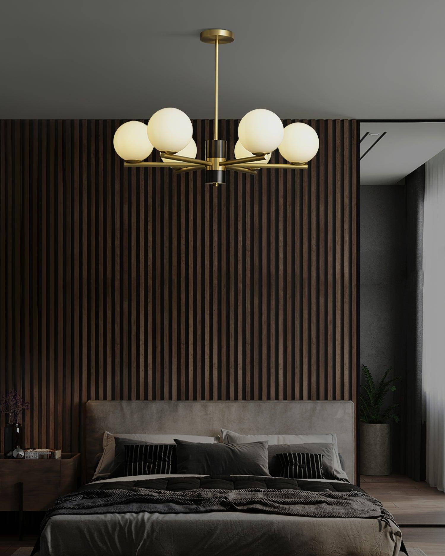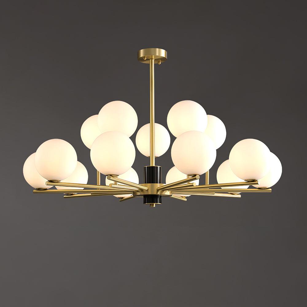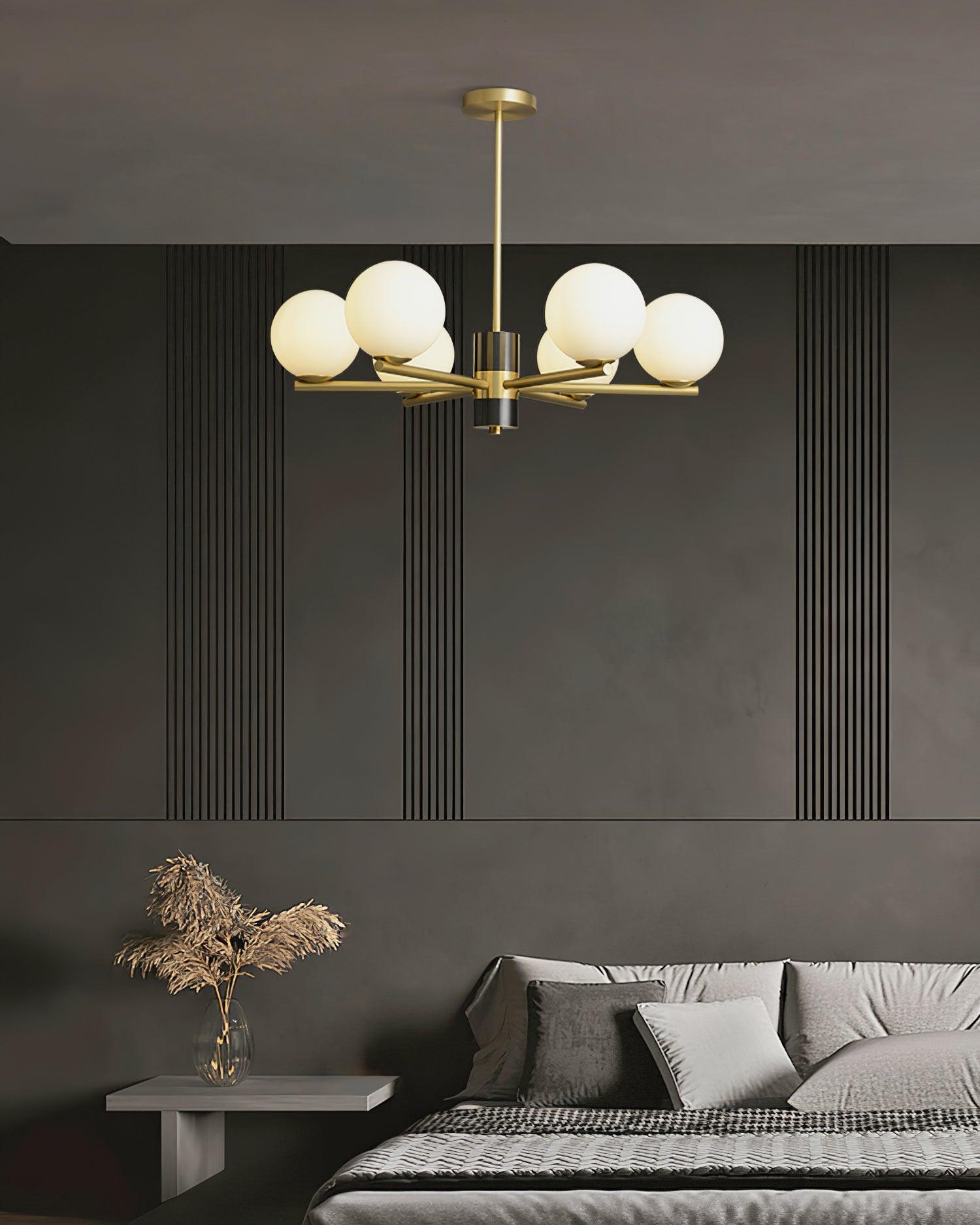 The Marais Chandelier provides a gentle. ambient light and creates a tranquil atmosphere. Its white glass spheres hang gracefully. giving it an elegant and refined look that adds a touch of minimalism to any home. Enjoy its calming presence and effervescent beauty.