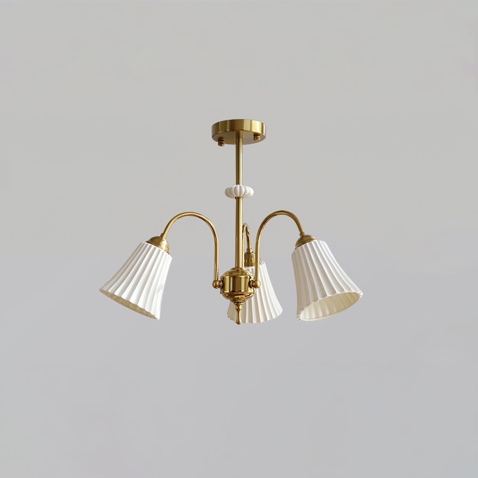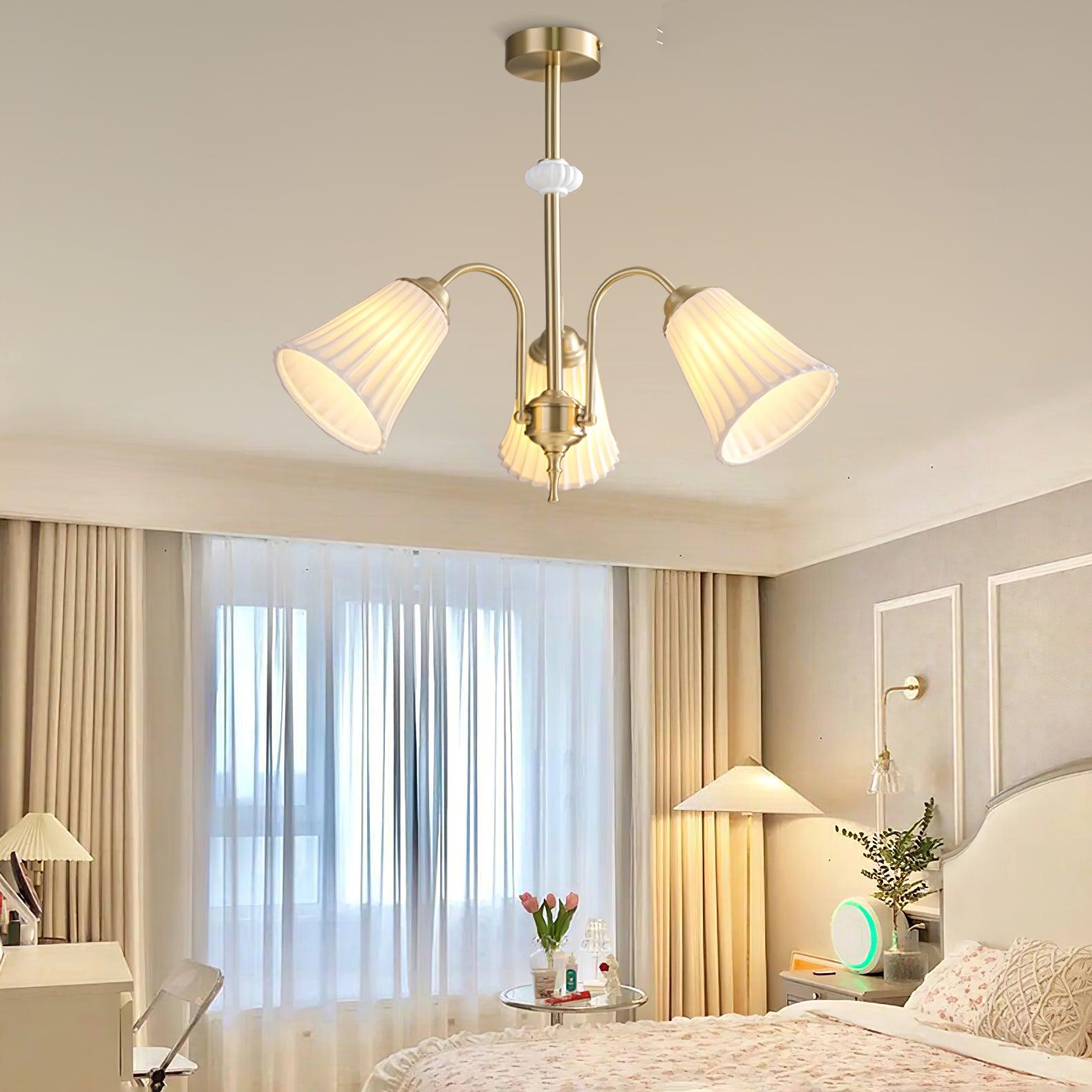 This Medieval Ceramic Trumpet Chandelier combines a classic and timeless design with quality materials. Handcrafted from durable ceramic. it features a gold-colored tubular arm frame and an ornate trumpet lampshade. Ideal for modern or traditional homes.