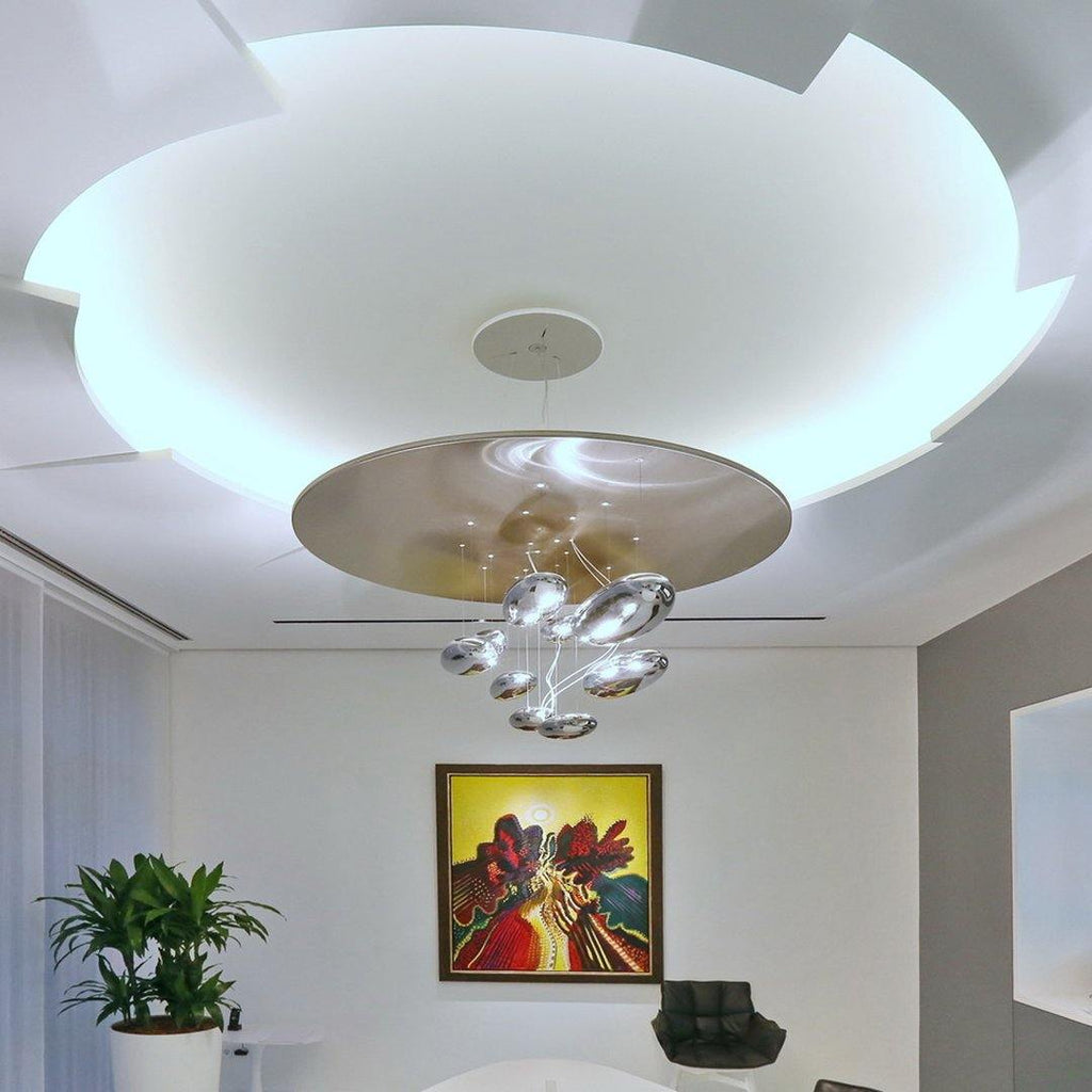 The lamp is available in suspended and ceiling versions. "A ceiling fixture that places floating assemblies of large pebbles beneath a simple modern aluminium disc. These in turn reflect each other. bouncing light between the biomorphic surfaces they teach and their surroundings .