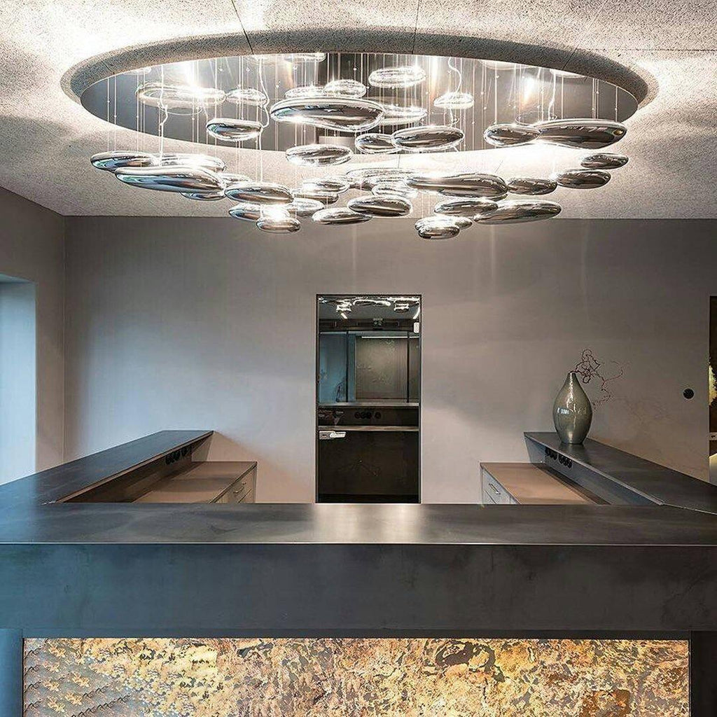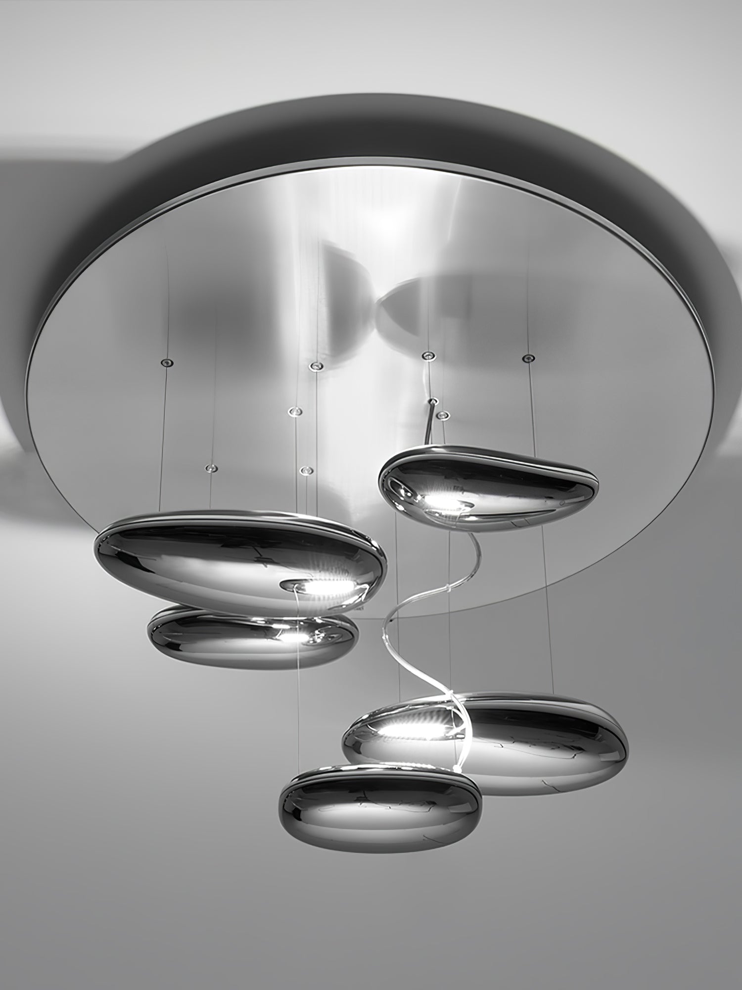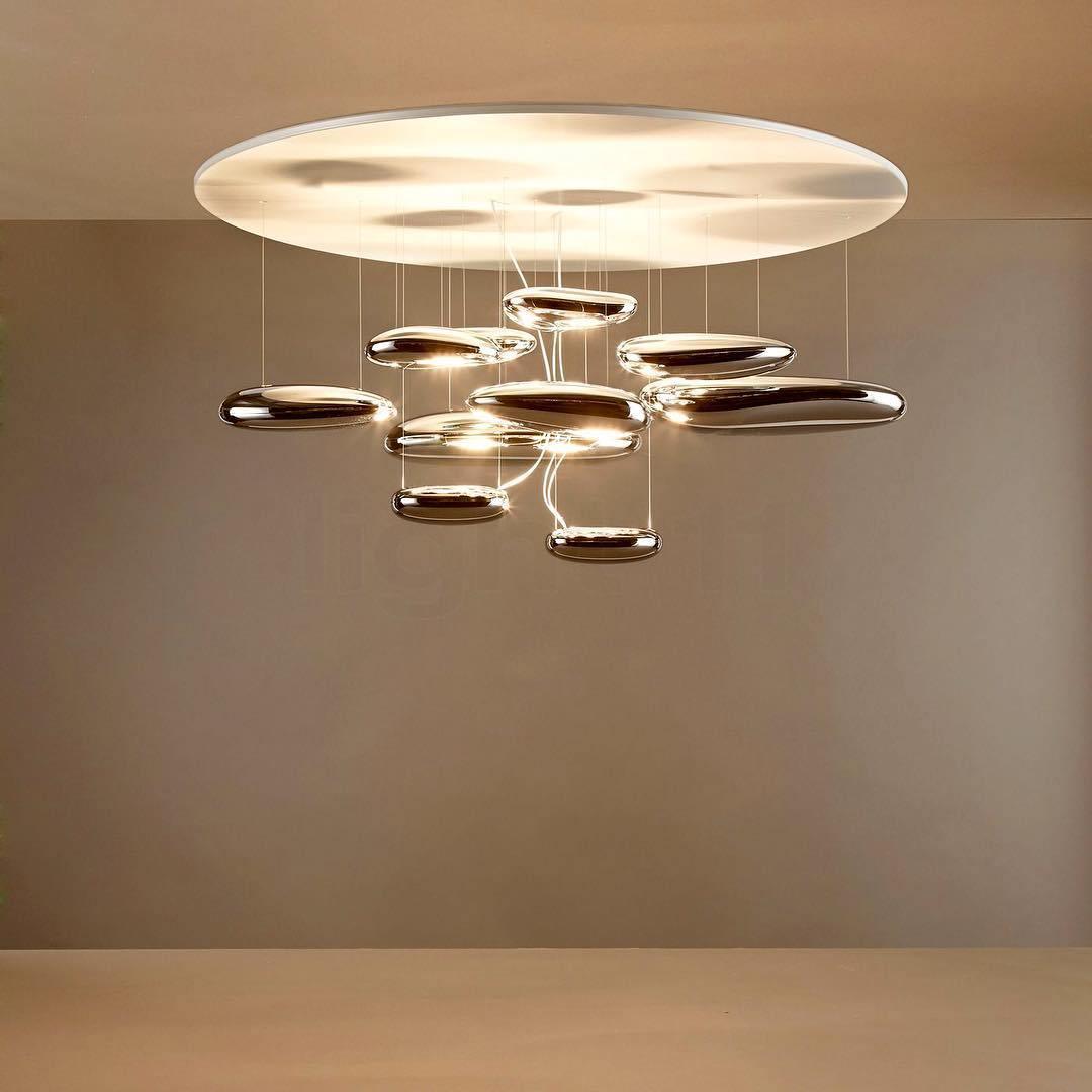 The lamp is available in suspended and ceiling versions. "A ceiling fixture that places floating assemblies of large pebbles beneath a simple modern aluminium disc. These in turn reflect each other. bouncing light between the biomorphic surfaces they teach and their surroundings .