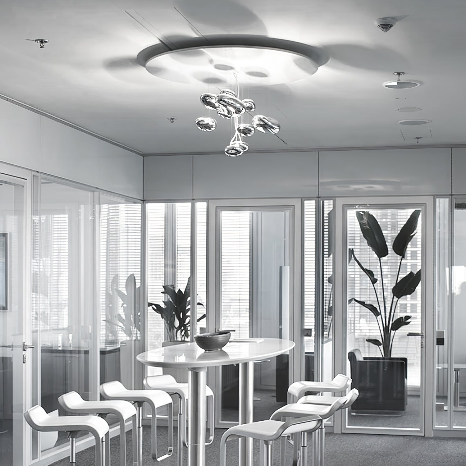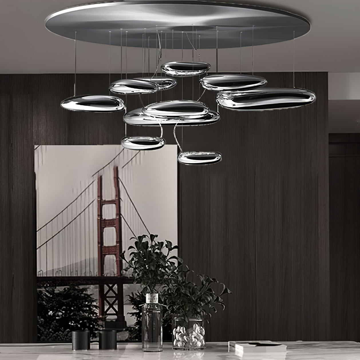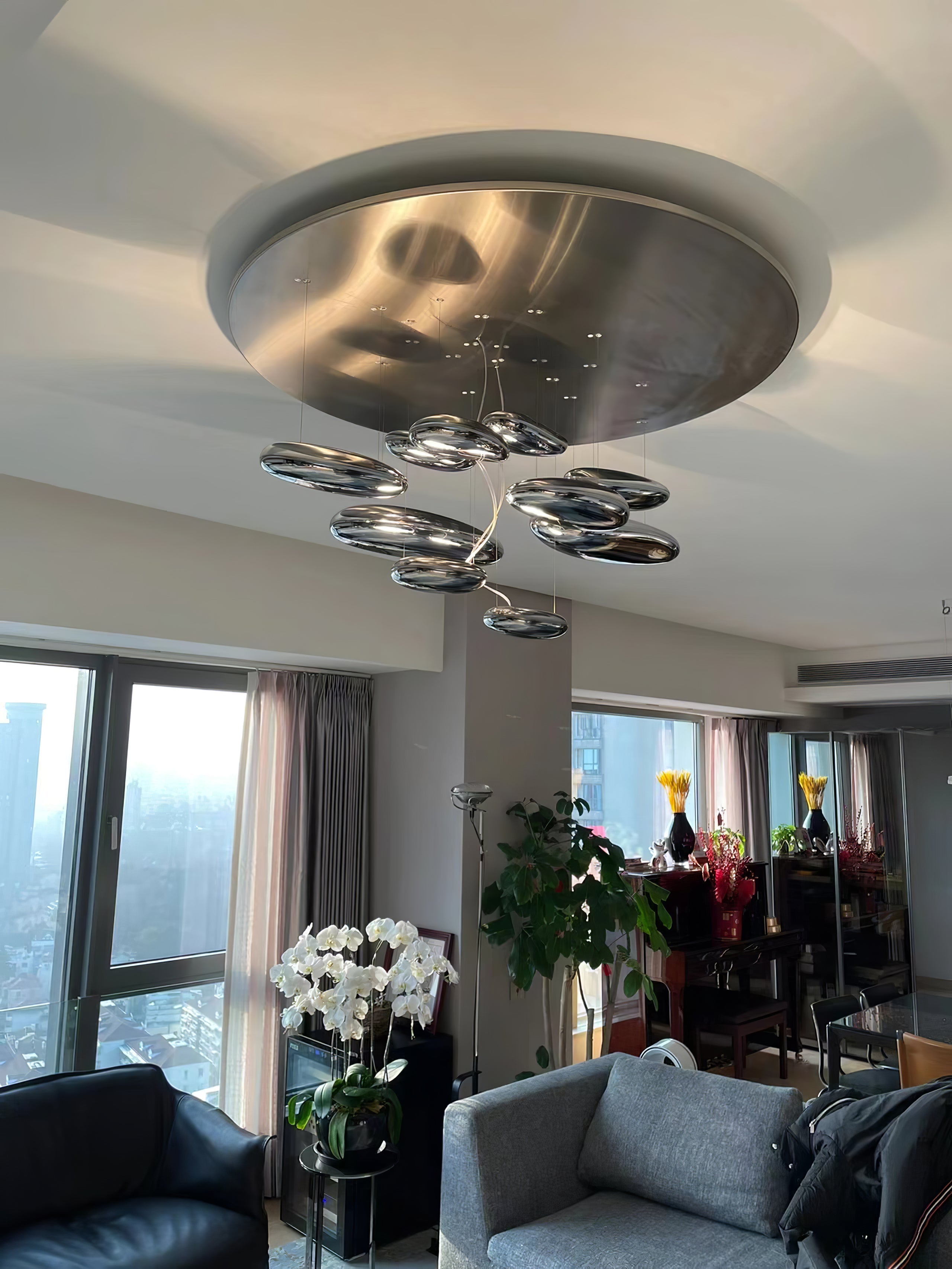 The lamp is available in suspended and ceiling versions. "A ceiling fixture that places floating assemblies of large pebbles beneath a simple modern aluminium disc. These in turn reflect each other. bouncing light between the biomorphic surfaces they teach and their surroundings .