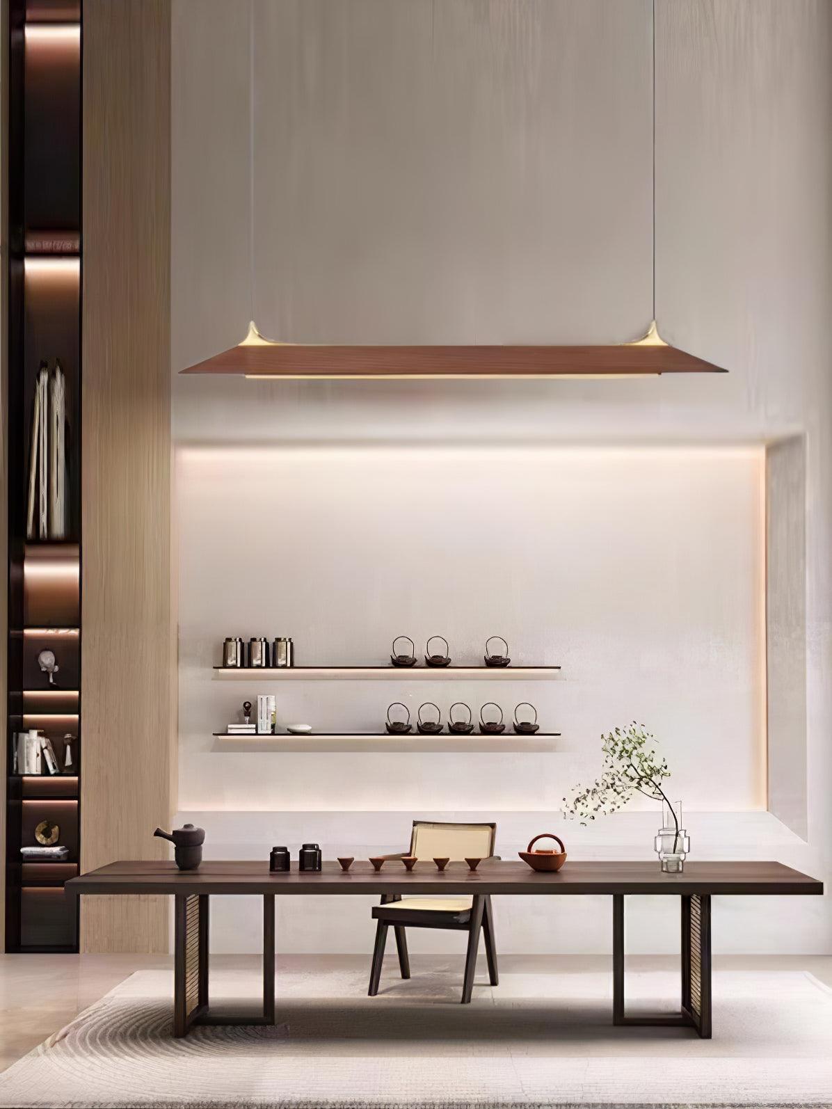 The Mernoe Wooden Chandelier is crafted from a single piece of wood cut to preserve its natural grain and treated with beeswax for a luxurious finish. Its lampshade is further ground and treated for a sharp and robust texture. The fittings are milled from solid brass and then sanded and polished to create a complementary reflection of the wood. This handcrafted piece ensures a distinguished and timeless look to any room.
