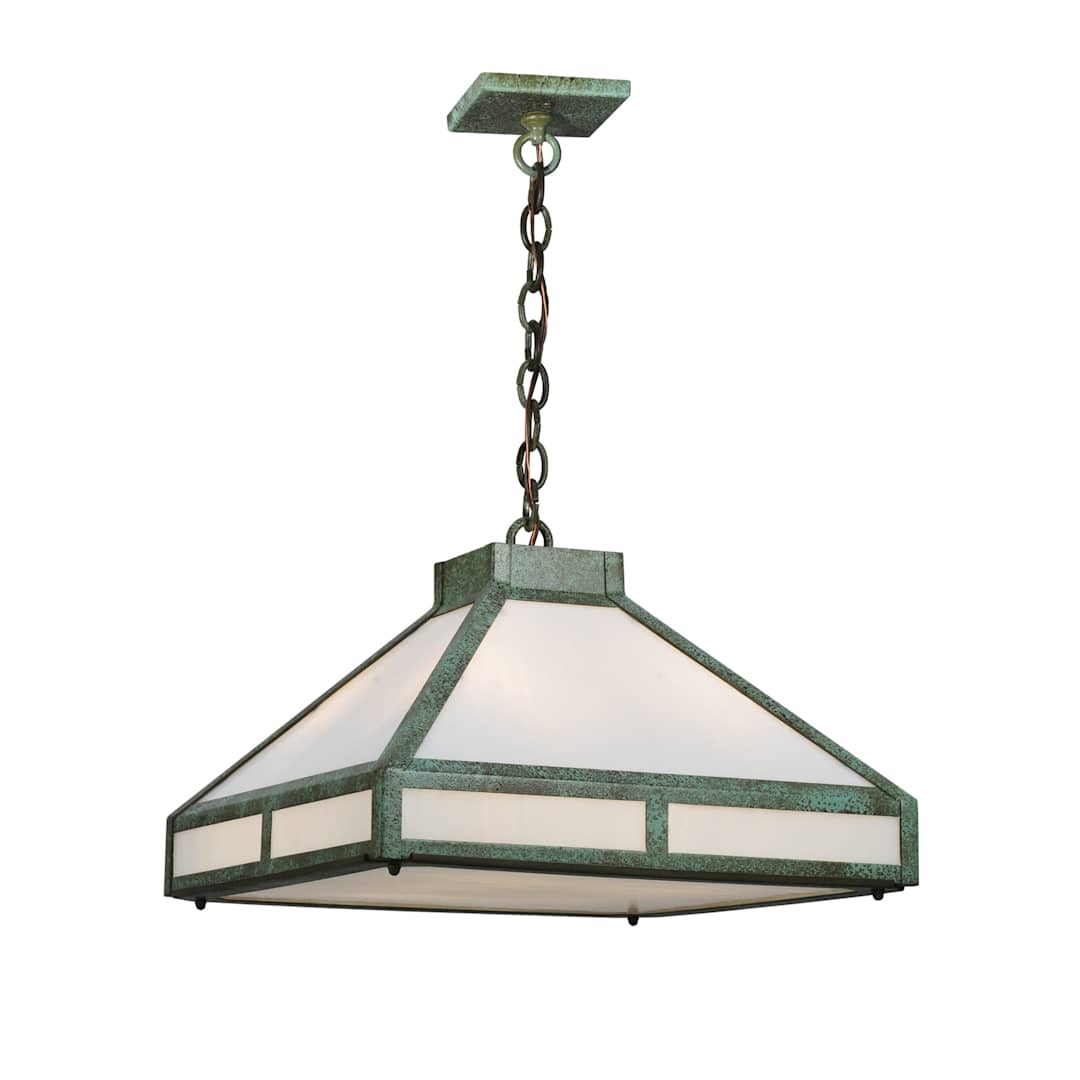 Elegant and sophisticated. the 18" Square "T" Mission Pendant by Meyda Tiffany is a perfect choice. The sun never sets at Meyda Tiffany and the artisans there worked hard to bring you this marvelous pendant utilizing 100 watts per bulb and a pyramid shaped shade.