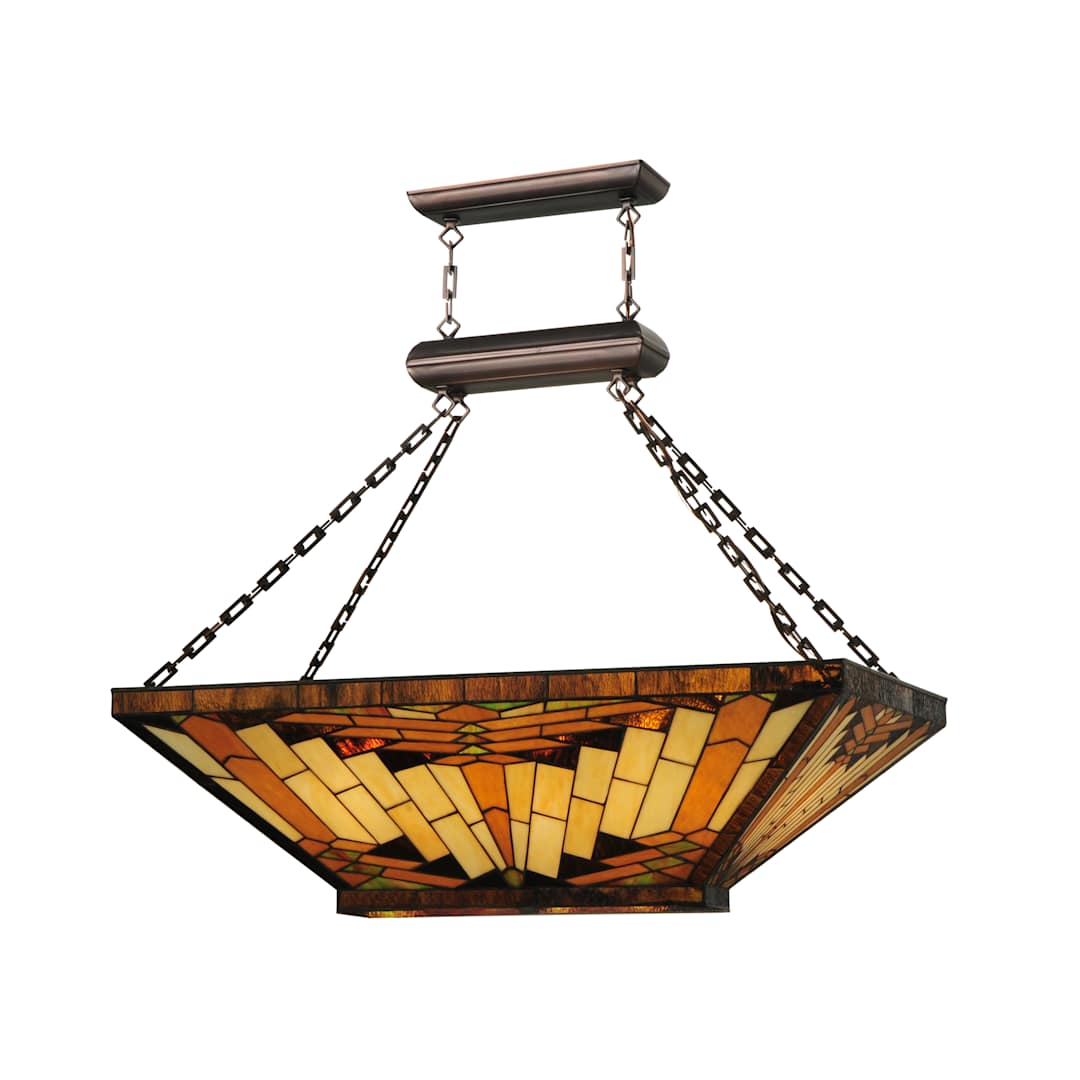 Charming and timeless. the 39" Length Nuevo Mission Inverted Pendant by Meyda Tiffany is a wonderful way to add something new and different. Meyda Tiffany is one of the few companies that still employs artisans capable of creating this charming pendant featuring 100 watts per bulb.