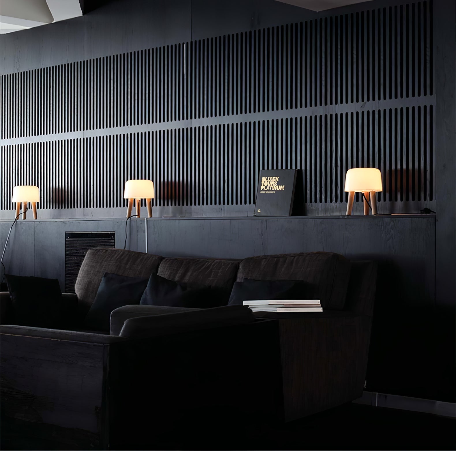 The Milk Table Lamp's design is reminiscent of the classic milking stool. with three solid white wax wood legs supporting a circular lampshade made of durable borosilicate glass. The curved surface of the lampshade and legs create a soft and adjustable lighting experience.