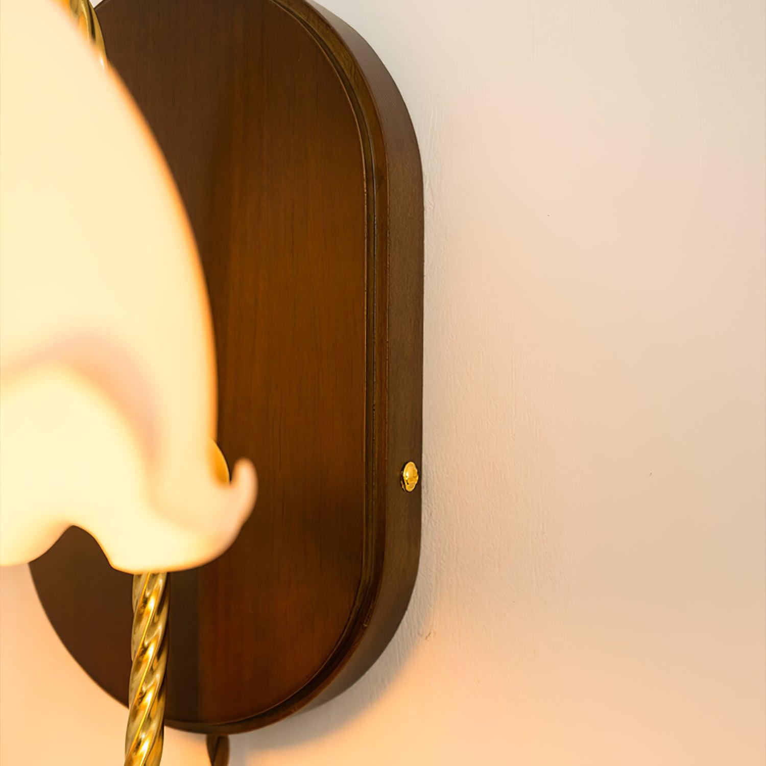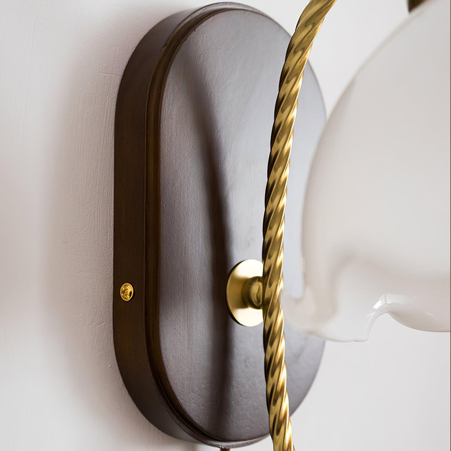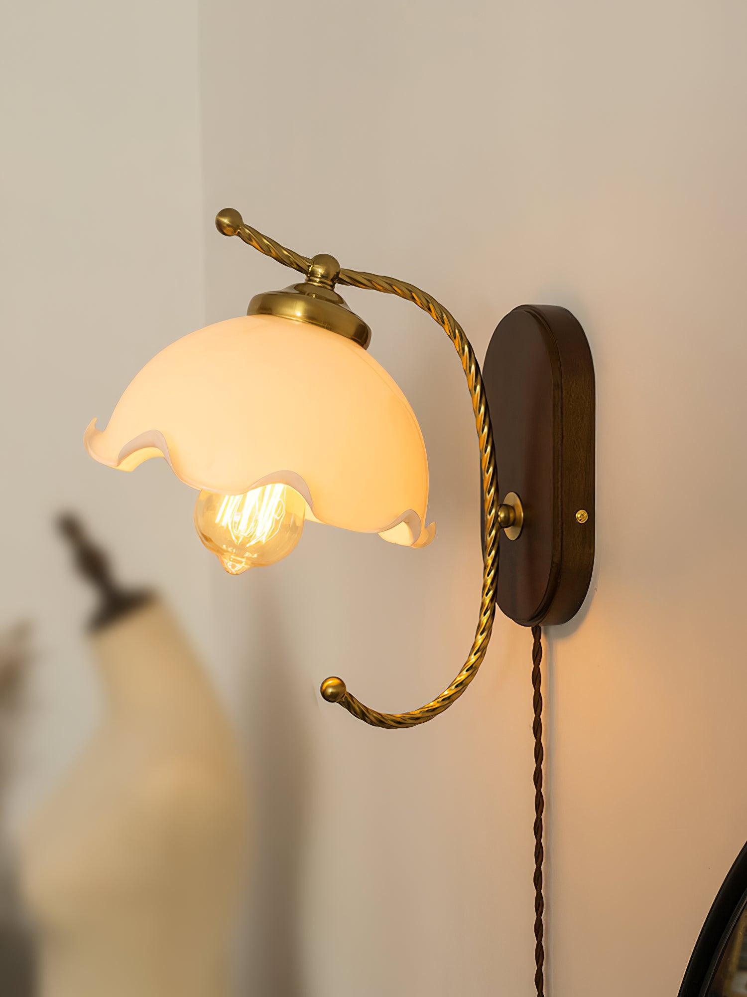 A modern update on the classic wall lamp. this is an eye-catching lighting centerpiece sure to raise admiration. The wall lamp features a striking flower lampshade. lamp body curving out downwards. this wall lamp is a stylish choice for a living room or living space.