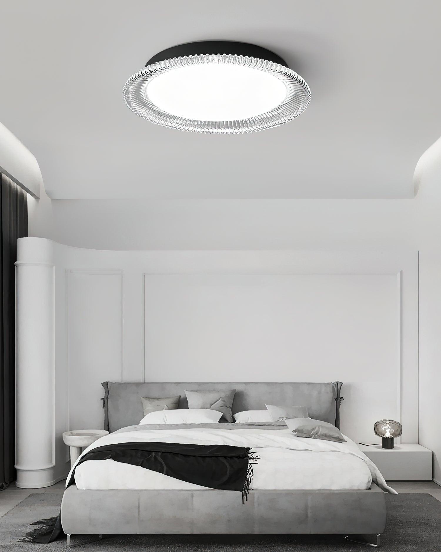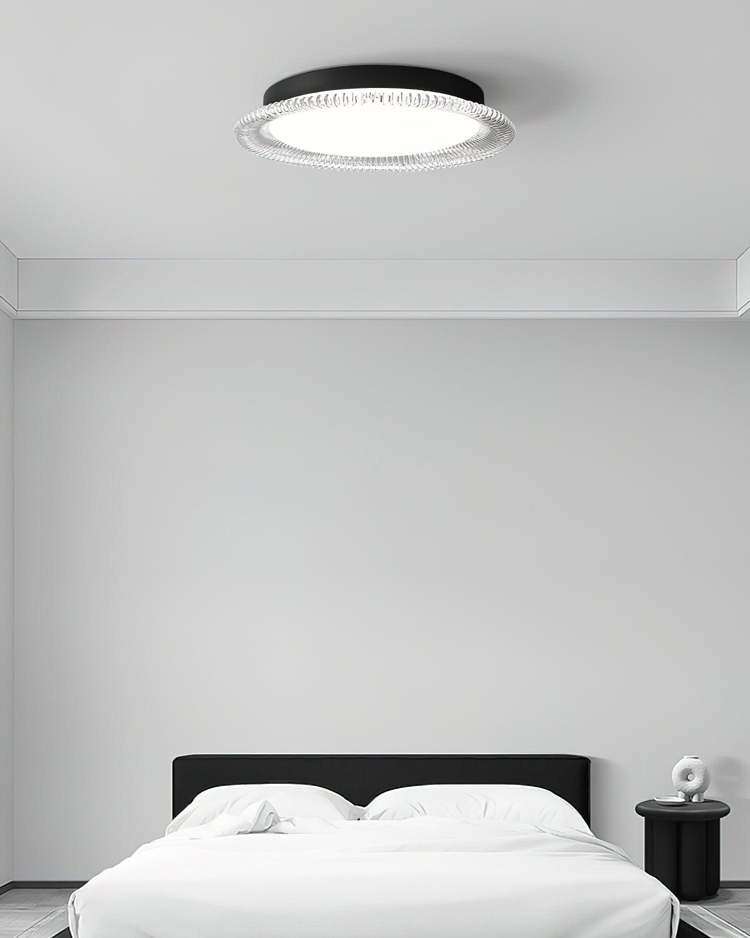 This lamp combines a sturdy aluminum frame with a unique acrylic engraved design to create a unique ring-shaped appearance. Light is emitted through the engraved acrylic. bringing delicate light and shadow changes to the interior while showing a simple. modern aesthetic.
