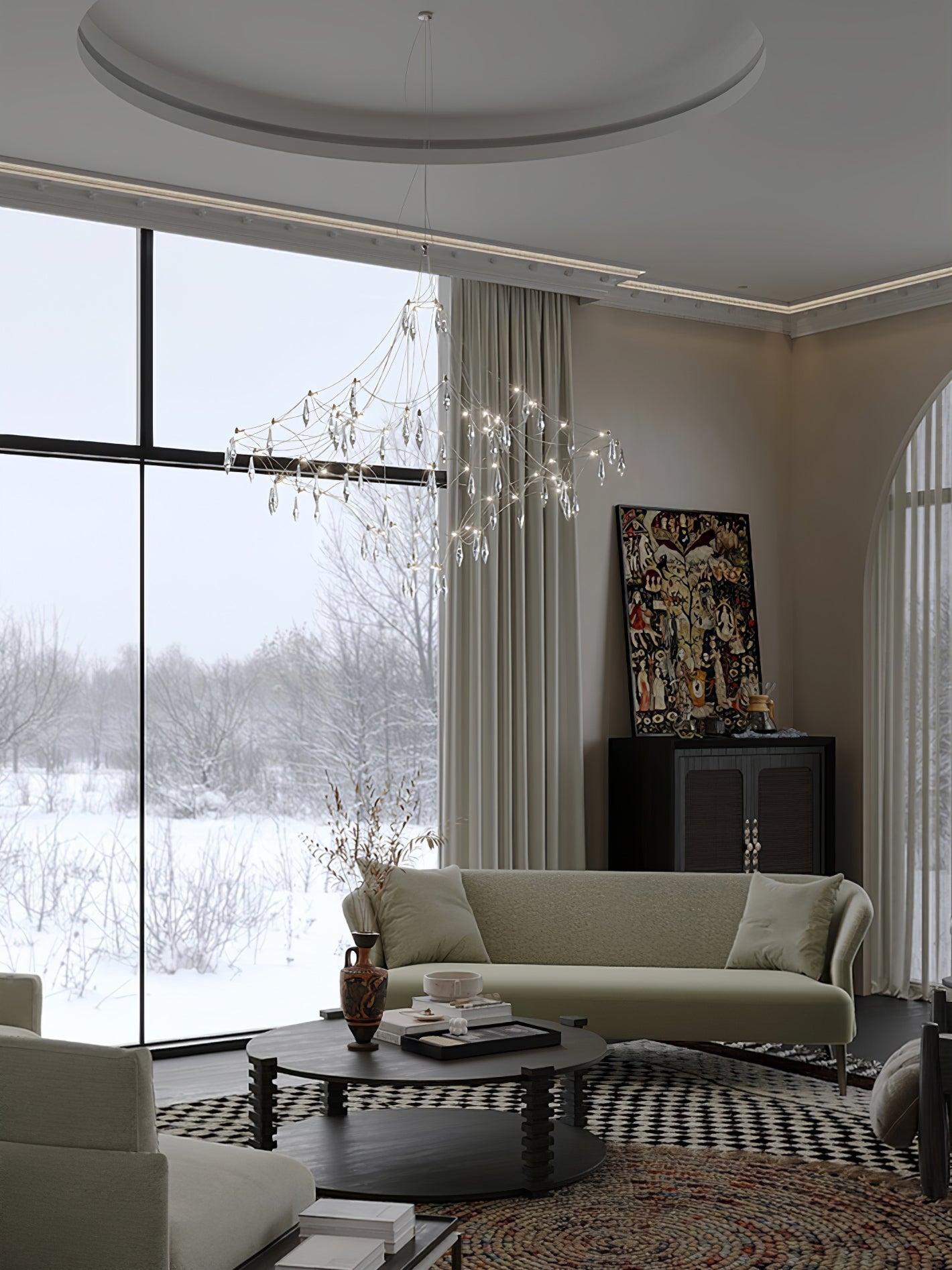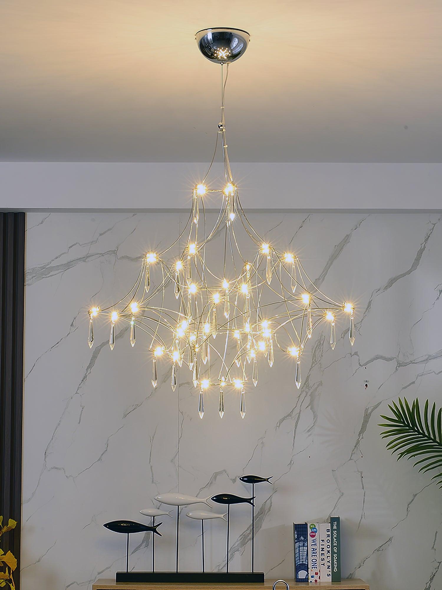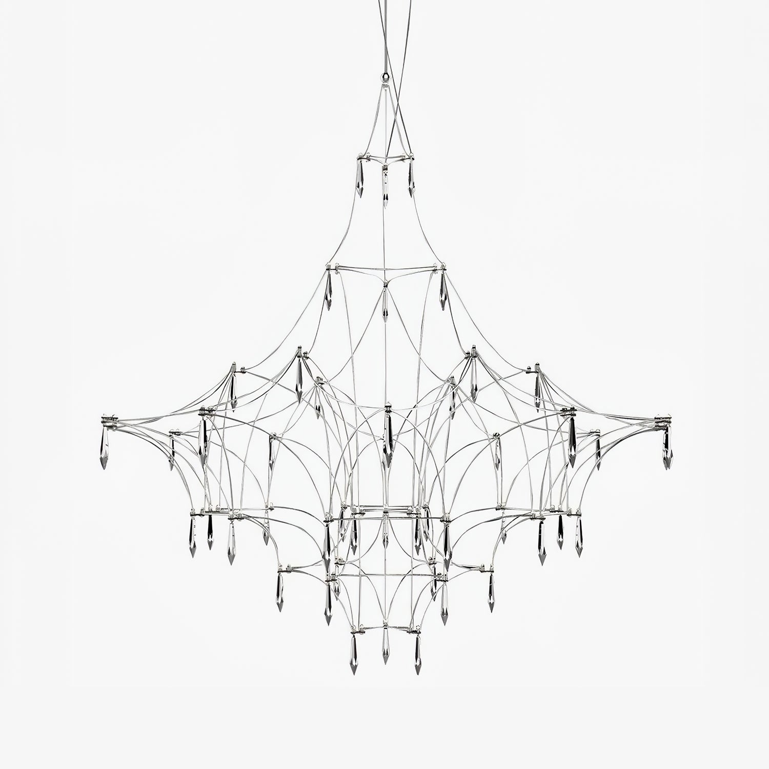 A sea of light from small stars. The trendsetting produces this luminaire with durable Stainless Steel and Crystal. The chosen materials make this luminaire appear like a light net despite being durable and resistant. The elaborately used crystals break and reflect the light of the numerous small illuminants. creating a fascinating play of light.