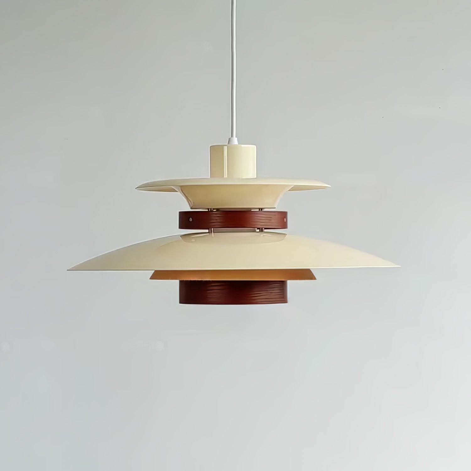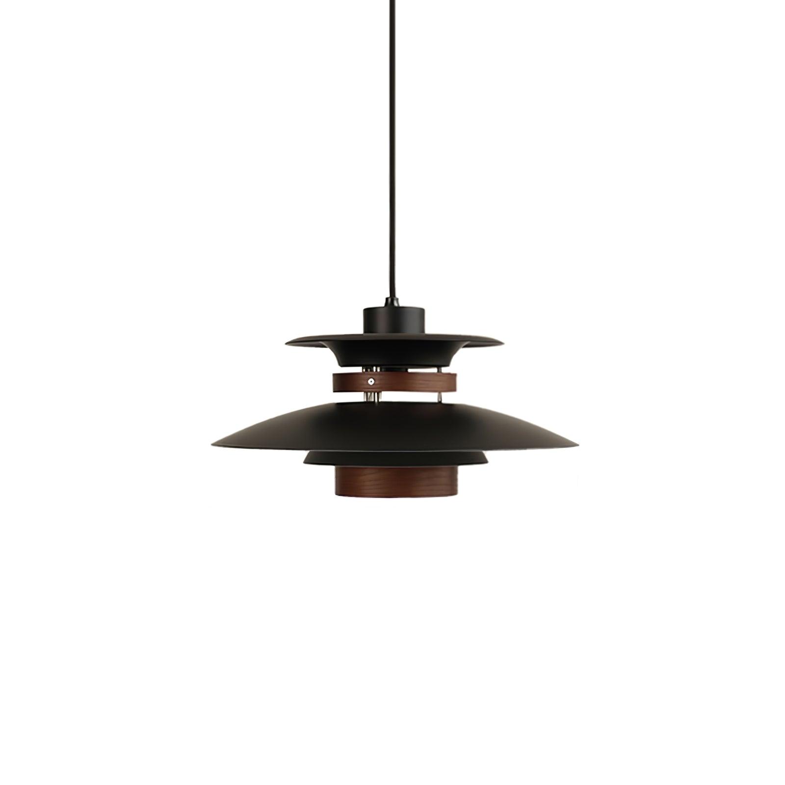 This elegant fixture exhibits a series of layered shades that produce a soft. diffused light. perfect for creating a warm and inviting atmosphere. The combination of sleek metal with warm wooden textures offers a modern twist on classic design elements.