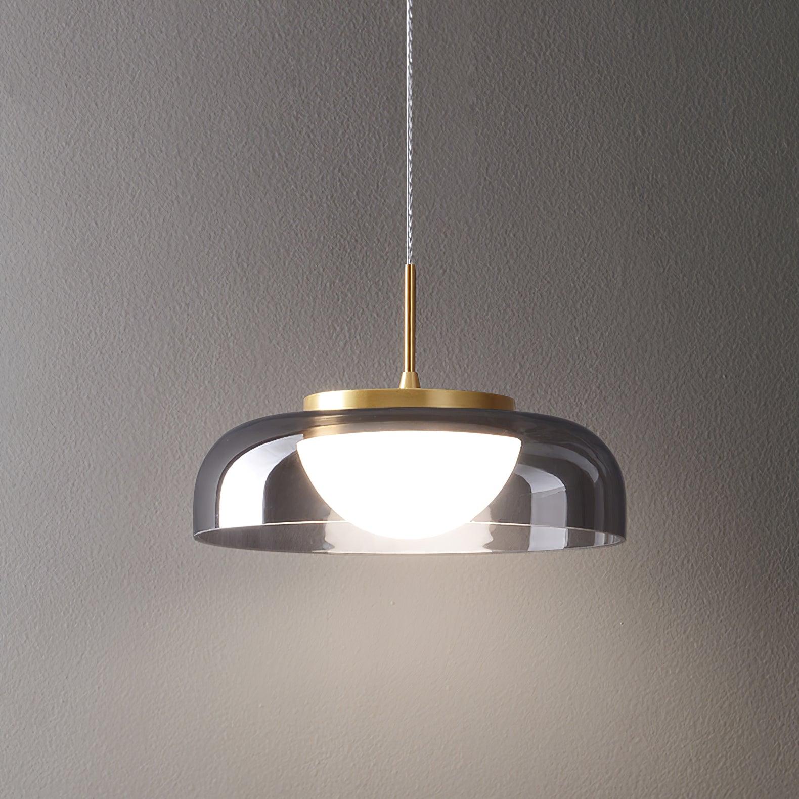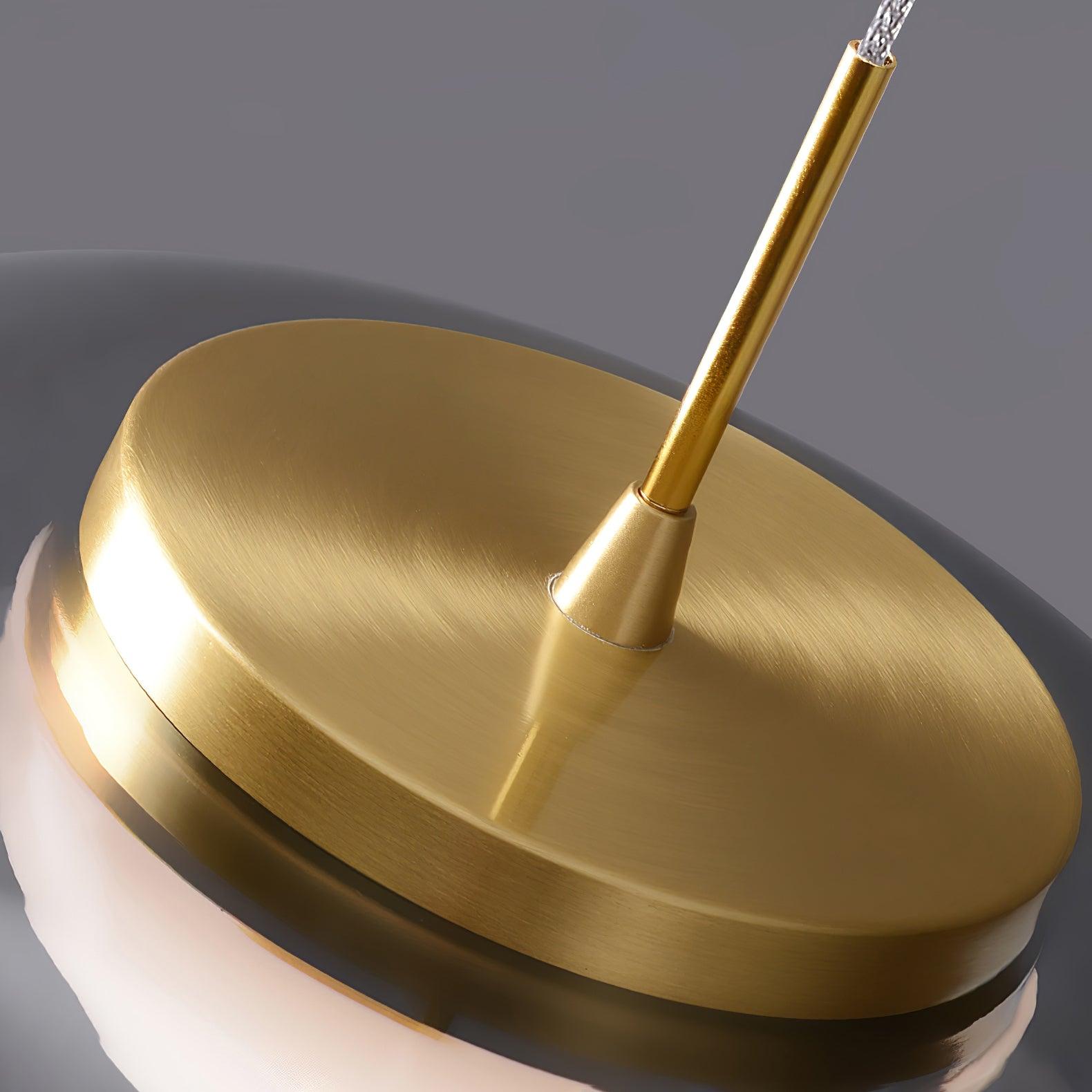 This luminary features a robust metal structure in a soft golden hue. from which a disc of translucent. smoky gray glass suspends. reminiscent of a lunar eclipse.