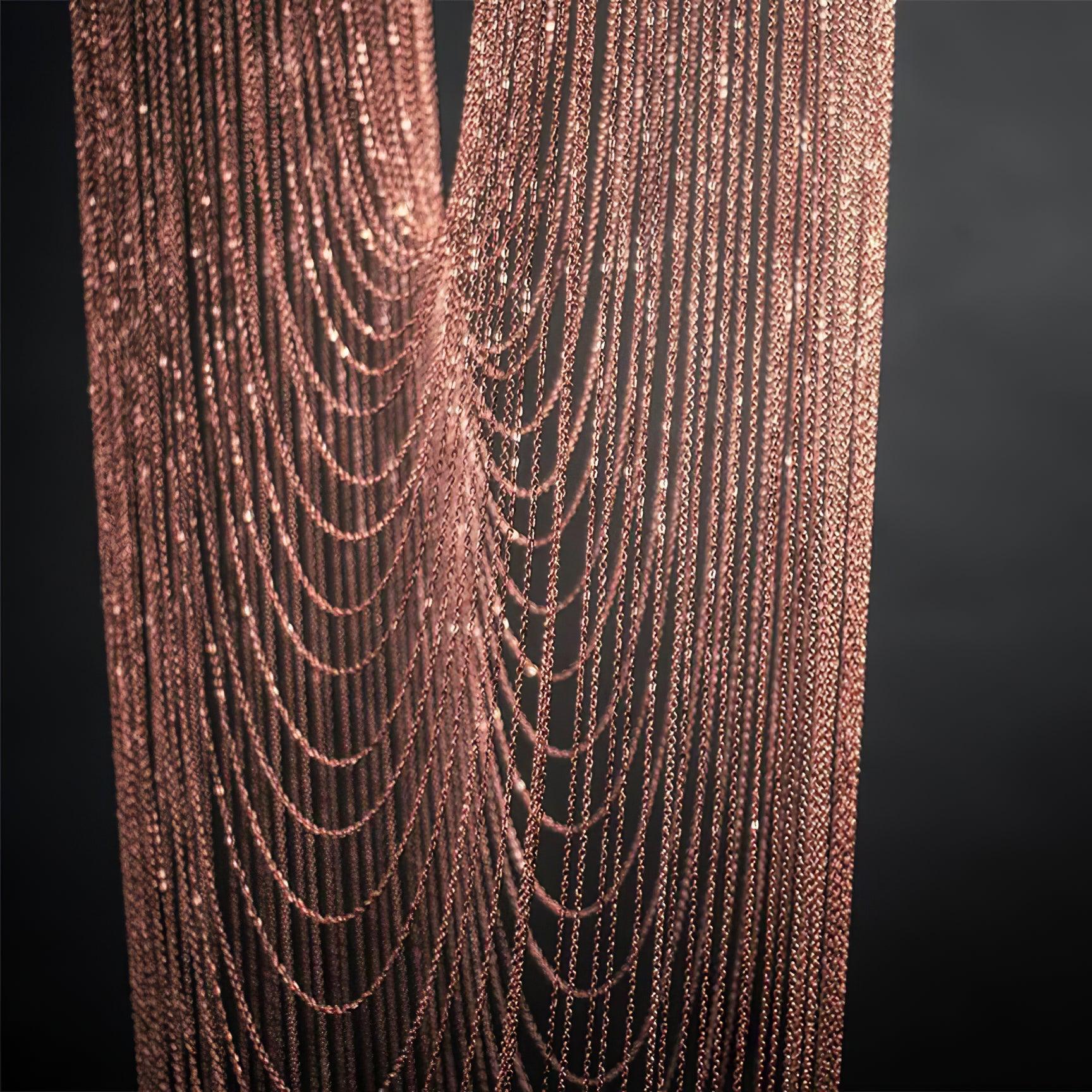 It is with a poetic beauty captured in this luxurious high-end lighting fixture that has been coated with warmth and elegance. that it will infect your daily life. This sculptural light is hand-crafted with delicate copper chains to create a unique and elegant curved shape inspired by the romantic world of jewelry. The light itself comes from two copper rings and goes through the chains to create a magic atmosphere.
