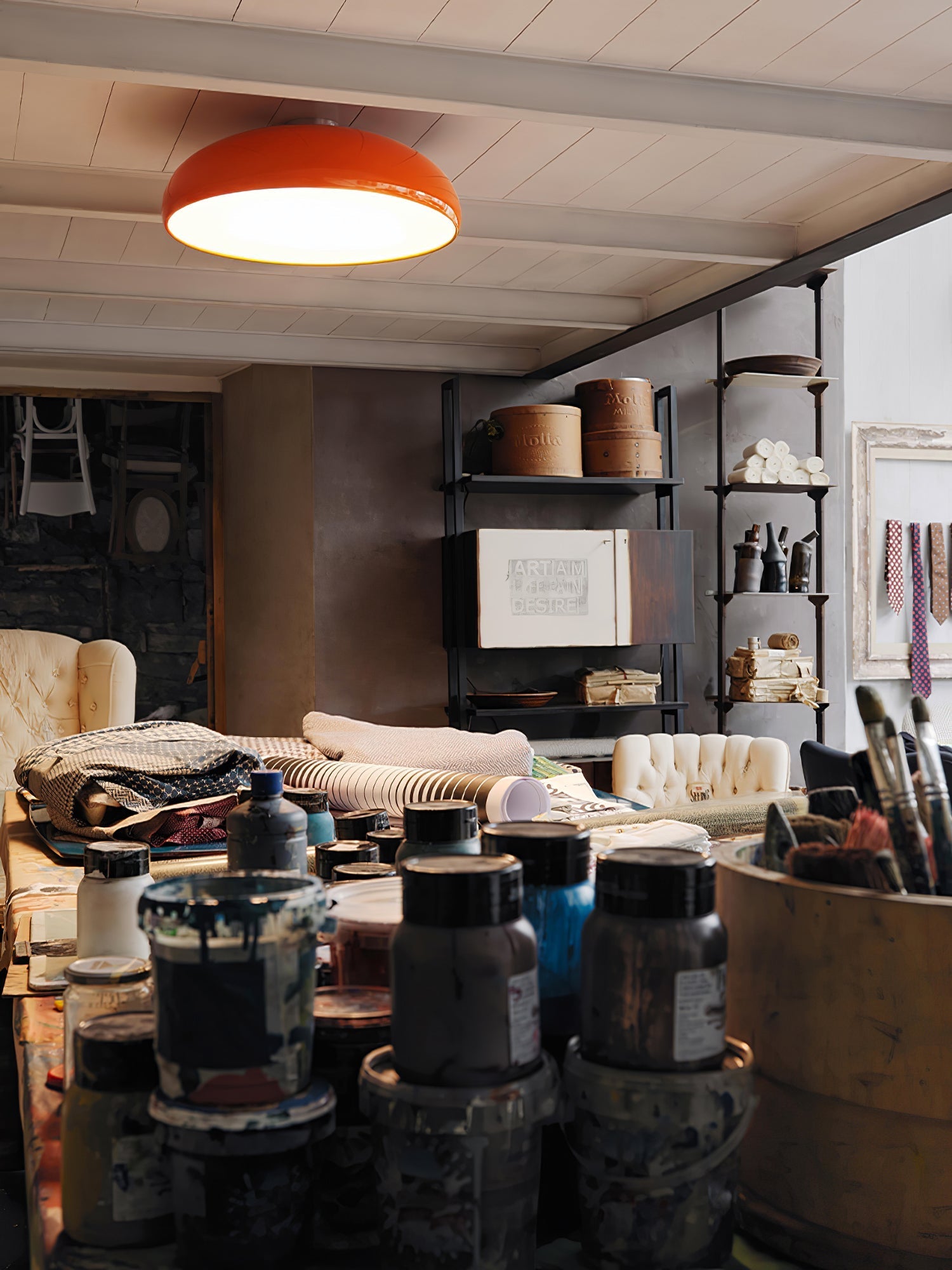 The Pangen Ceiling Lamp seamlessly blends luxurious form and function for endless appeal. Its velvety polycarbonate diffuser provides abundant. soft illumination. while the glossy aluminum dome is a captivating modern statement. Enhancing any space with its subtle sophistication. this piece is a timeless addition to any elegant abode.