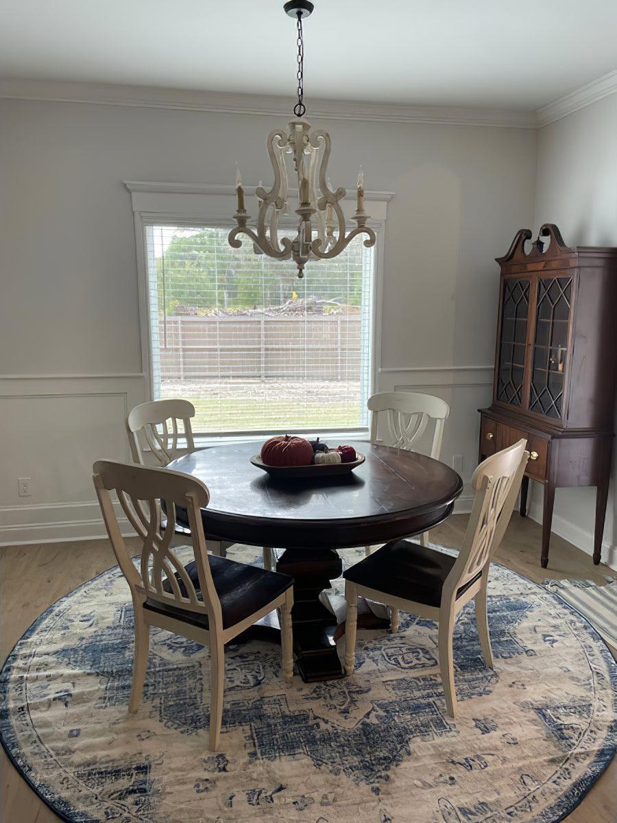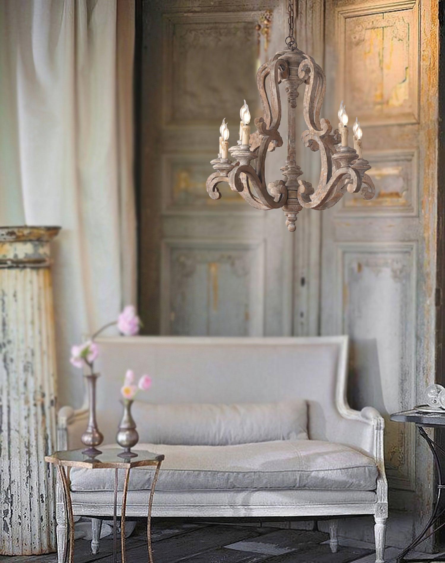 Infuse a refreshing cottage feel to your home with this wooden chandelier. Crafted of wood with a distressed antique white finish. this farmhouse chandelier features a candelabra base with Four candle-style lights. lending a touch of elegance to your dining room or foyer while dispersing plenty of light over the space.