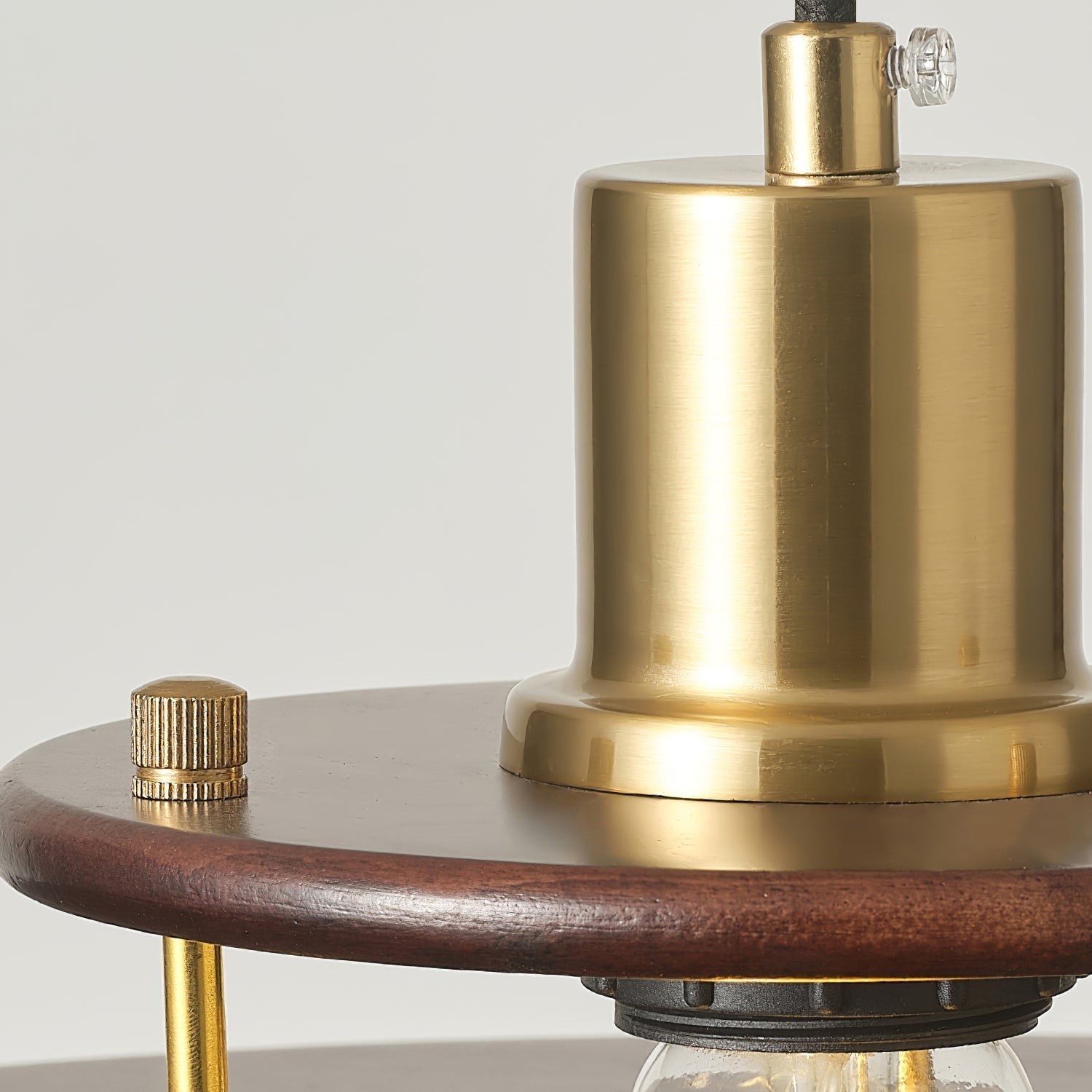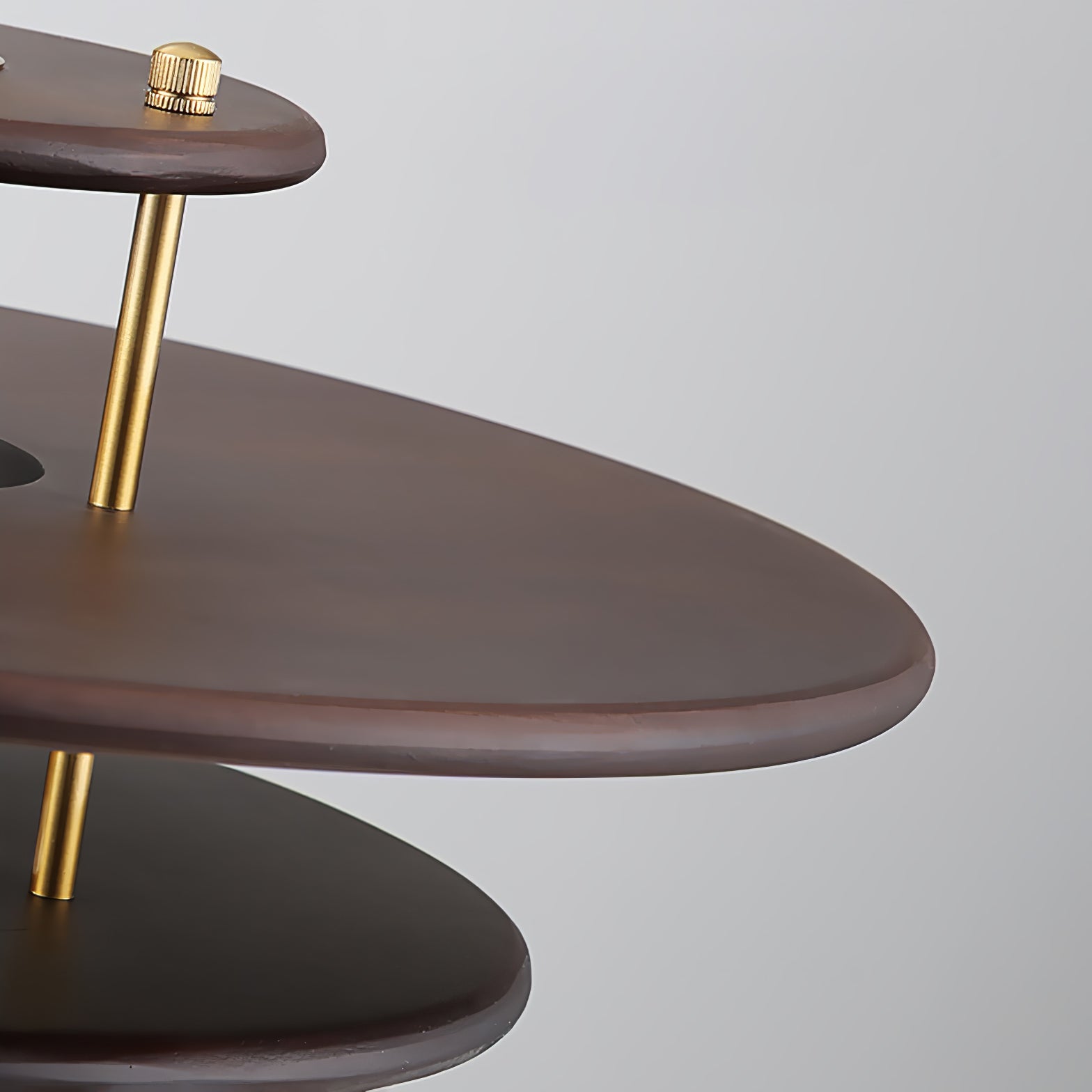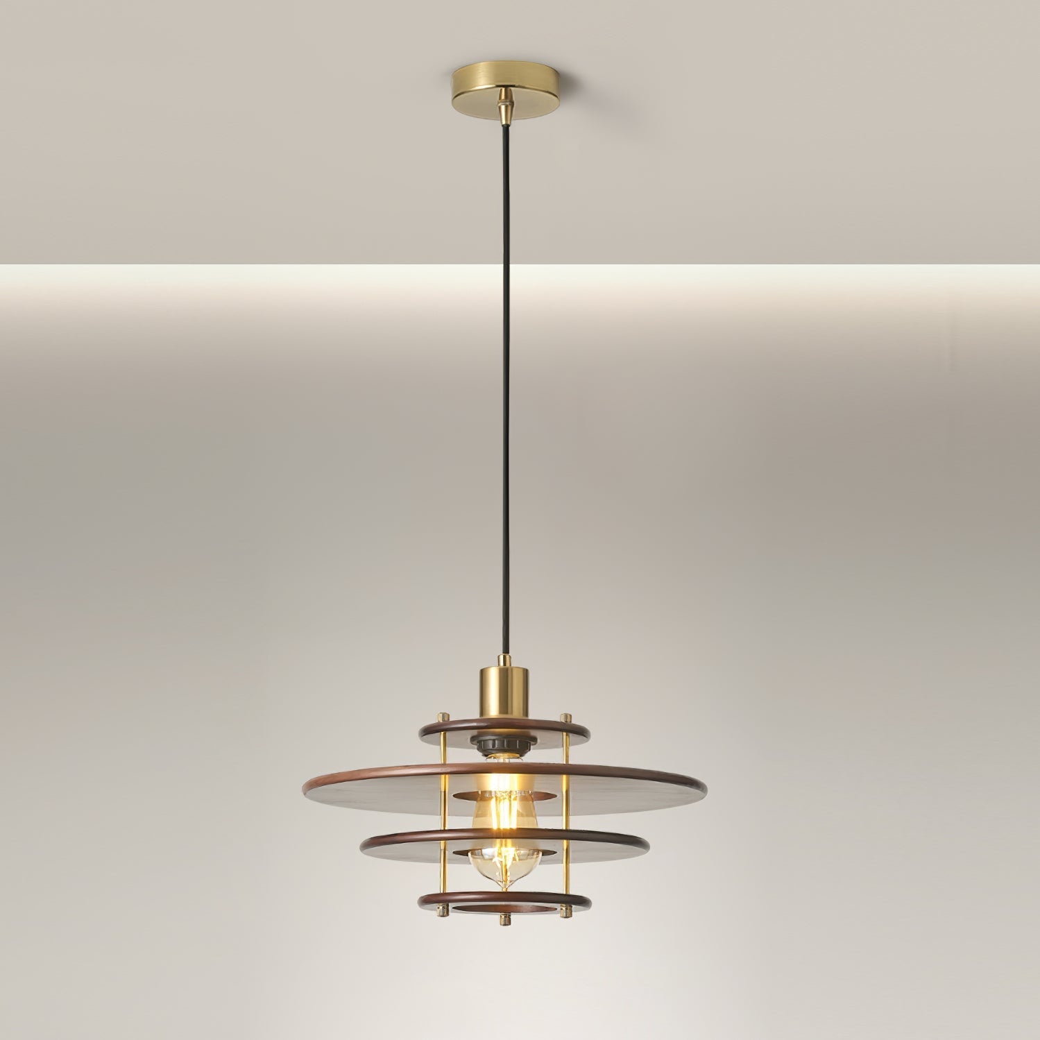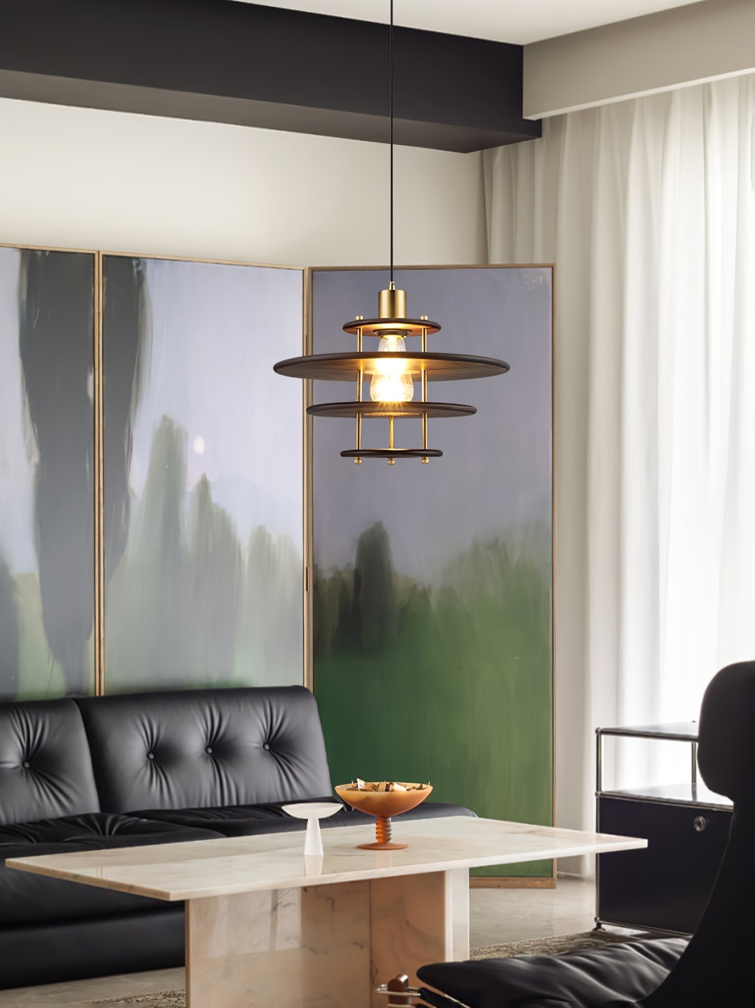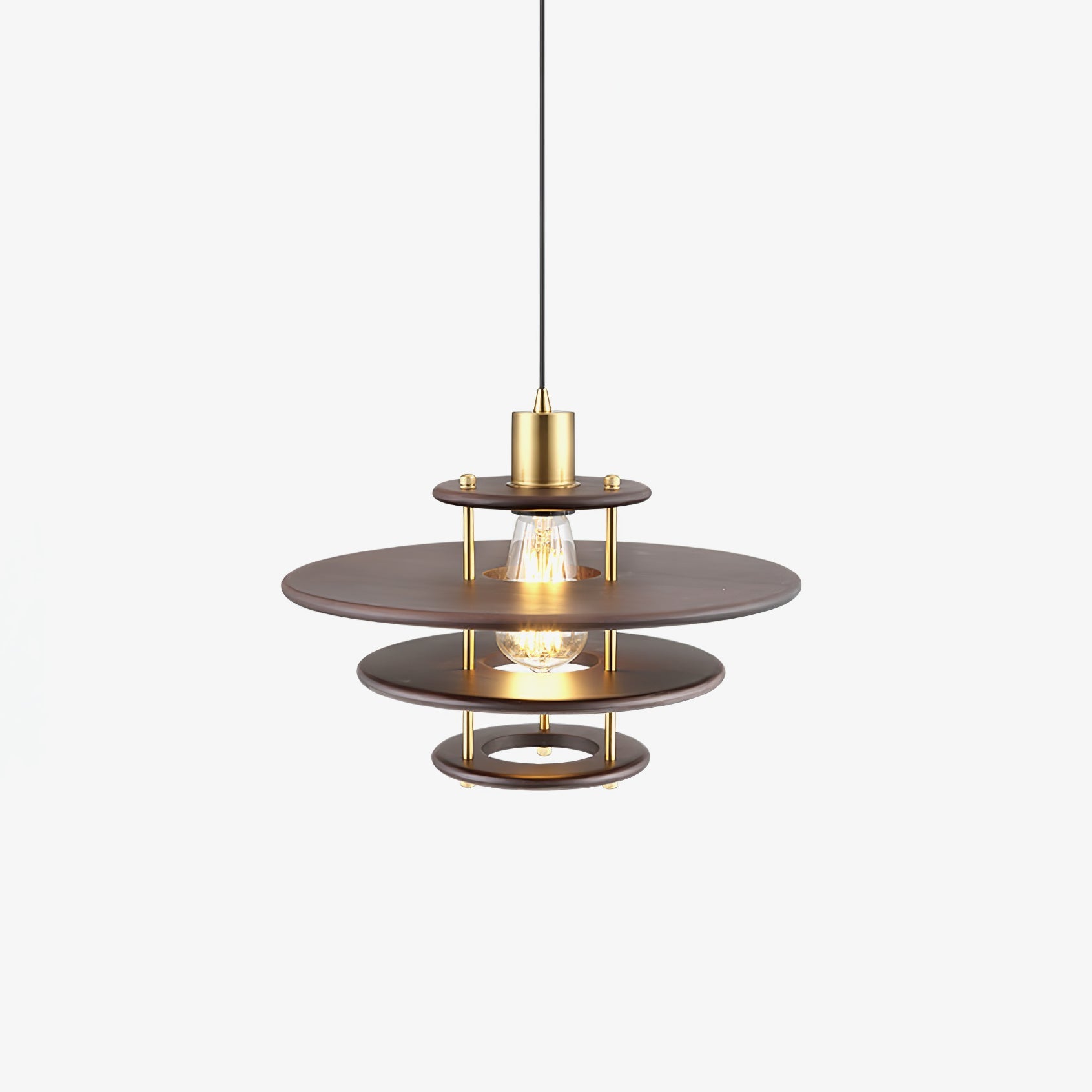 The Pendel Pendant Lamp is a sleek and sophisticated mid-century modern inspired fixture that combines style and function. Featuring a unique design reminiscent of planetary rings. this lamp will become the focal point of any room. casting a warm. ambient light that enhances the atmosphere while providing sufficient illumination. The use of sleek wooden accents and a central golden column adds to its elegant and layered look.