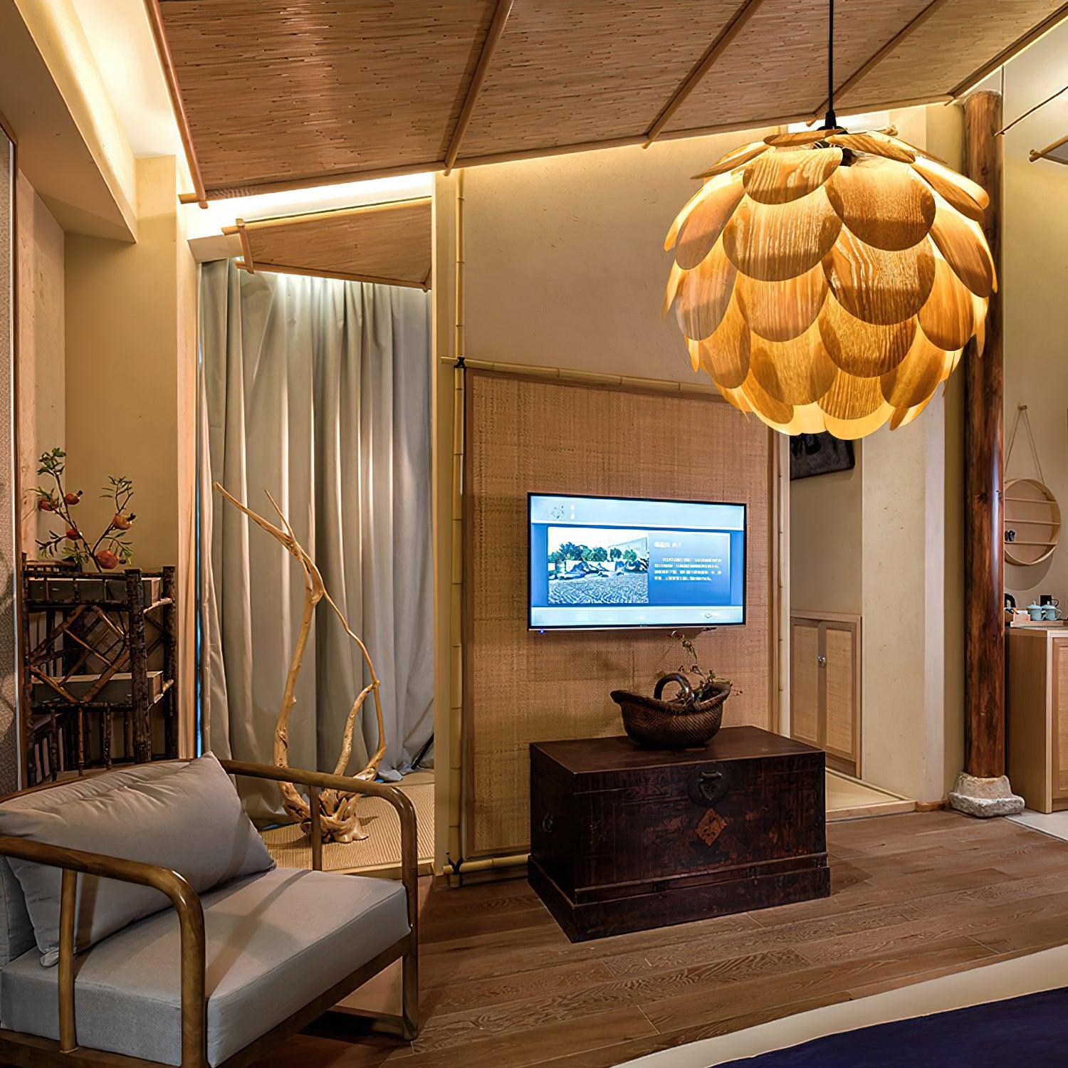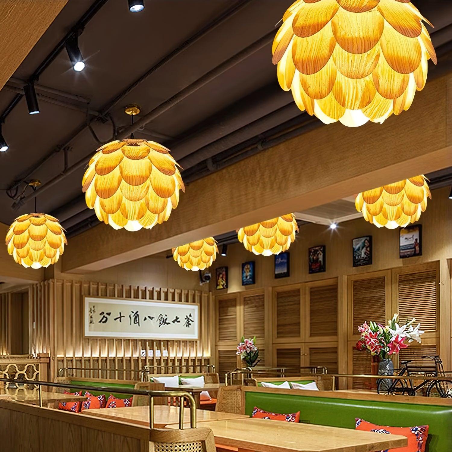 Crafted from natural ash wood. the Pinecone Pendant Light is a unique and elegant addition to any space. The intricately formed lamp body adds a touch of nature and warmth to your home decor. Illuminate your room with style and sophistication.