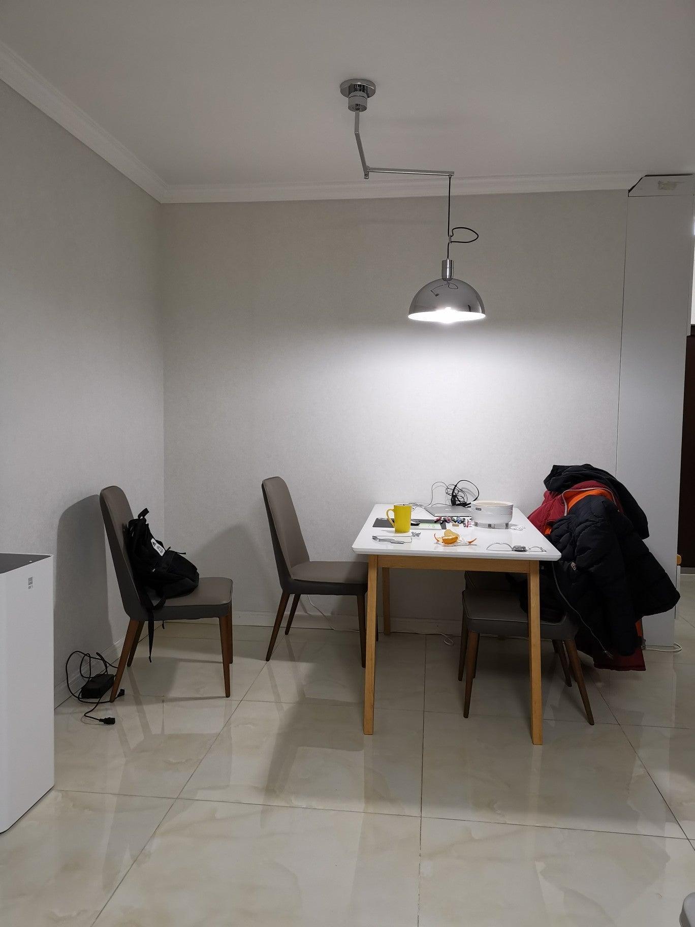 Adjustable pendant lamp where both the central position and height can be adjusted by means of an adjustable arm and a cable clamp.