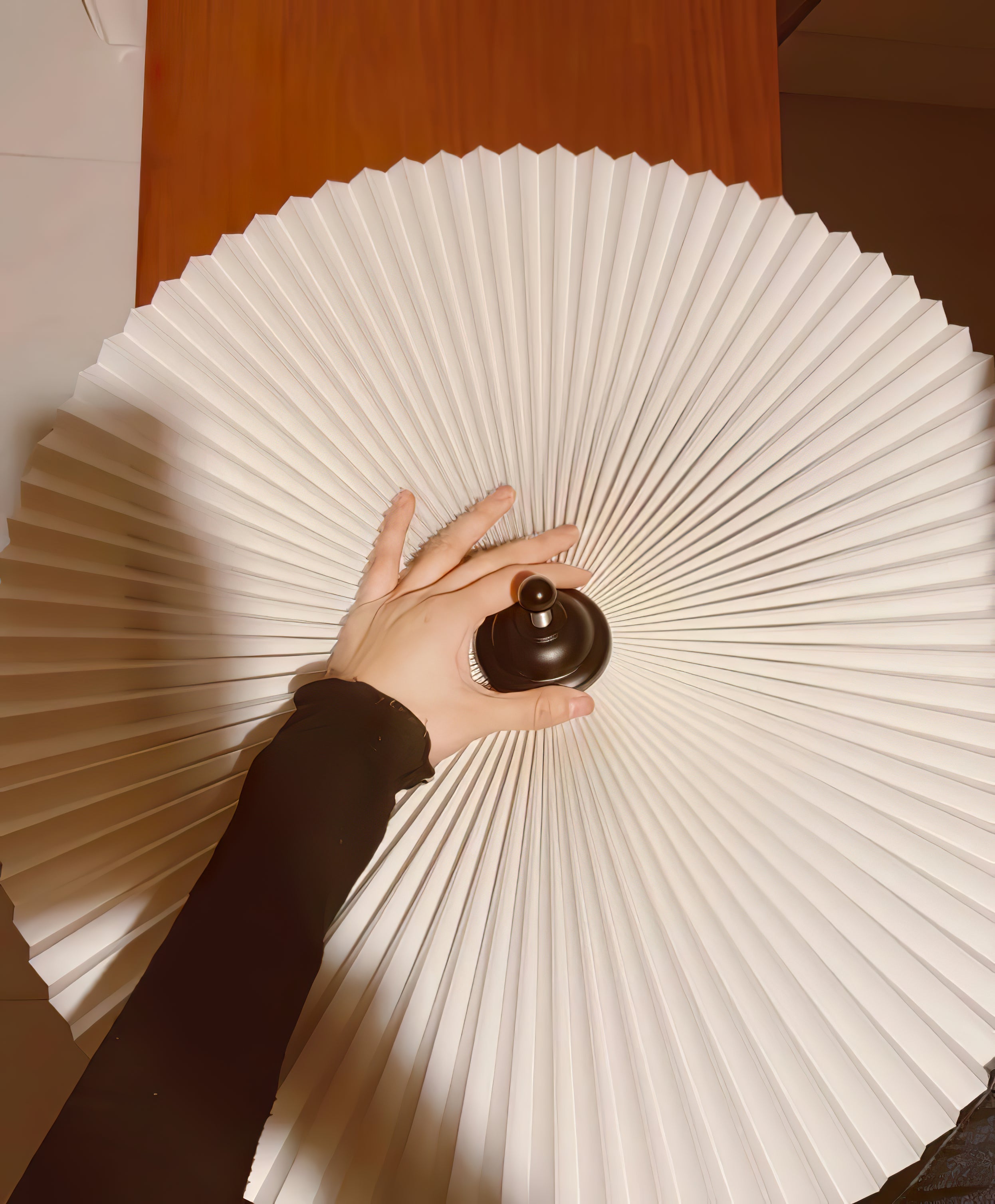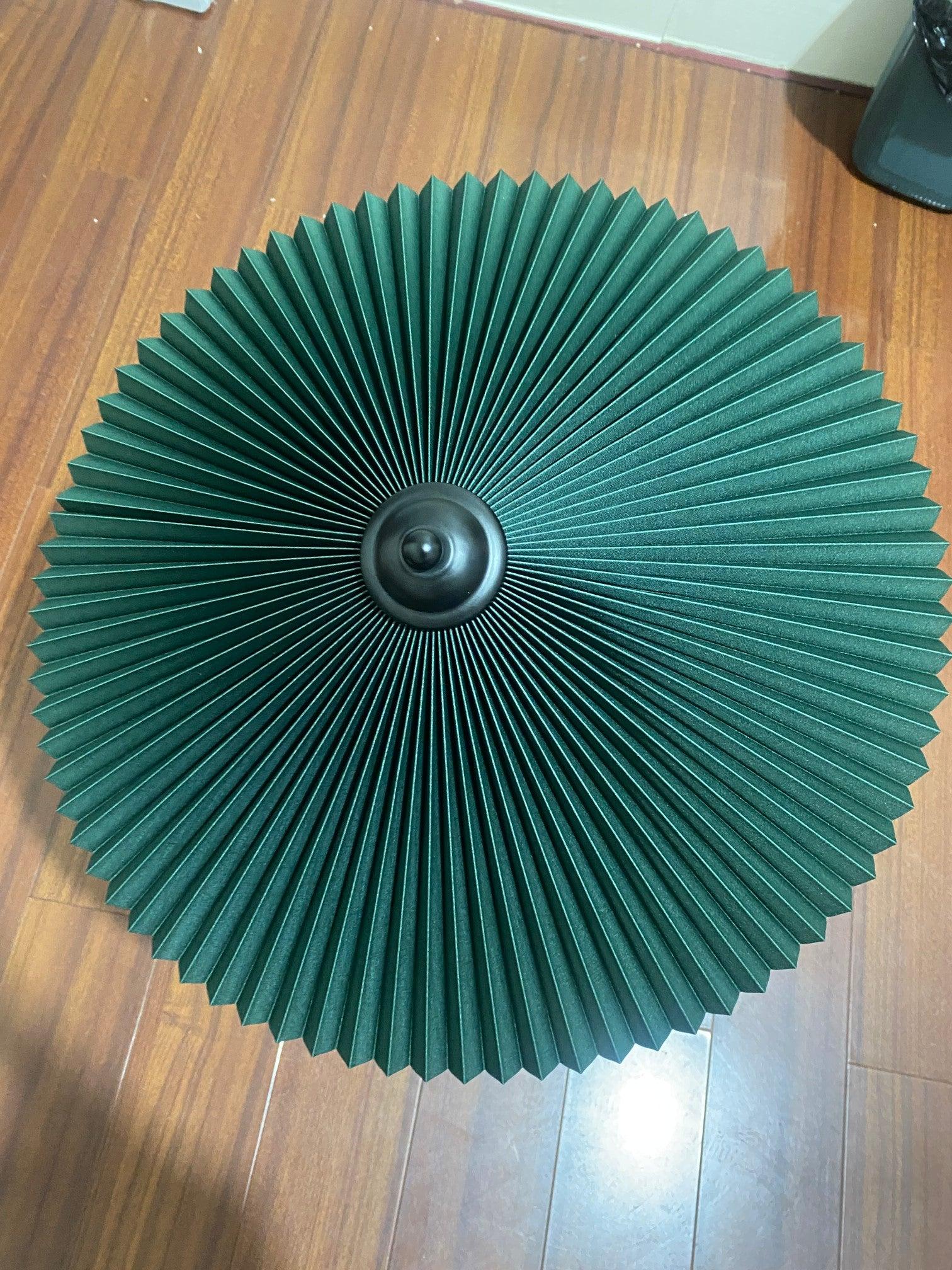 This lamp was inspired by a pleated hat/ old lampshade I found. The handcrafted Sicilian Iron base has been designed to complement the subtle lightness of the pleated lampshade. Measuring approximately 75cm in height with a cappello of 43cm in diameter. the lamp will need some basic assembly before use.