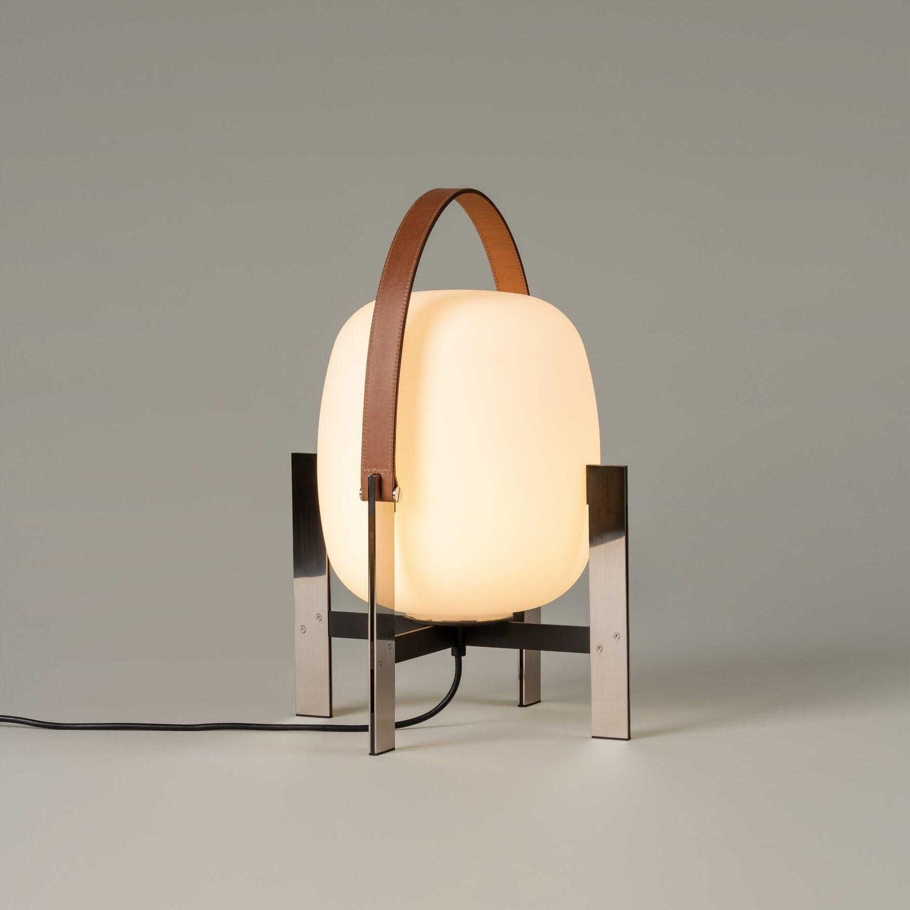 This Portable Lantern Table Lamp is crafted with expert precision. marrying strength and fragility for a unique design. The angles and curves of the steel are contrasted with the soft leather handle. while the delicate opal globe is safely held in place by well-designed brackets.