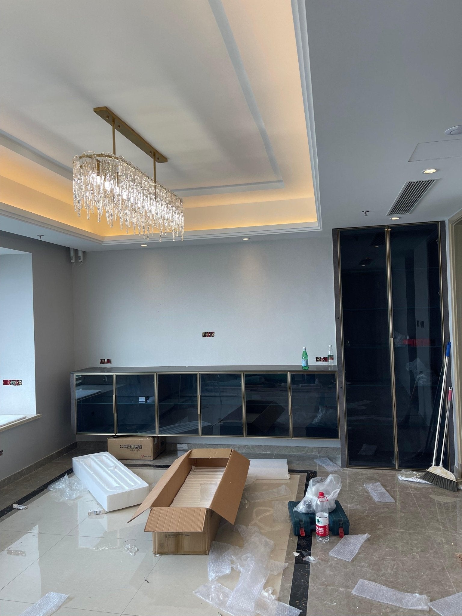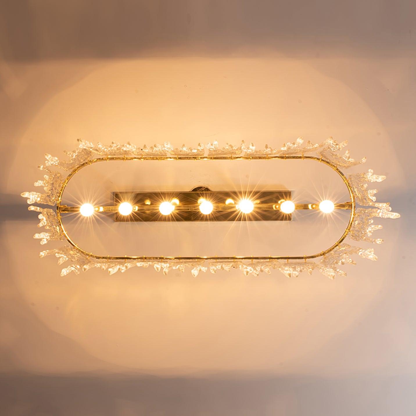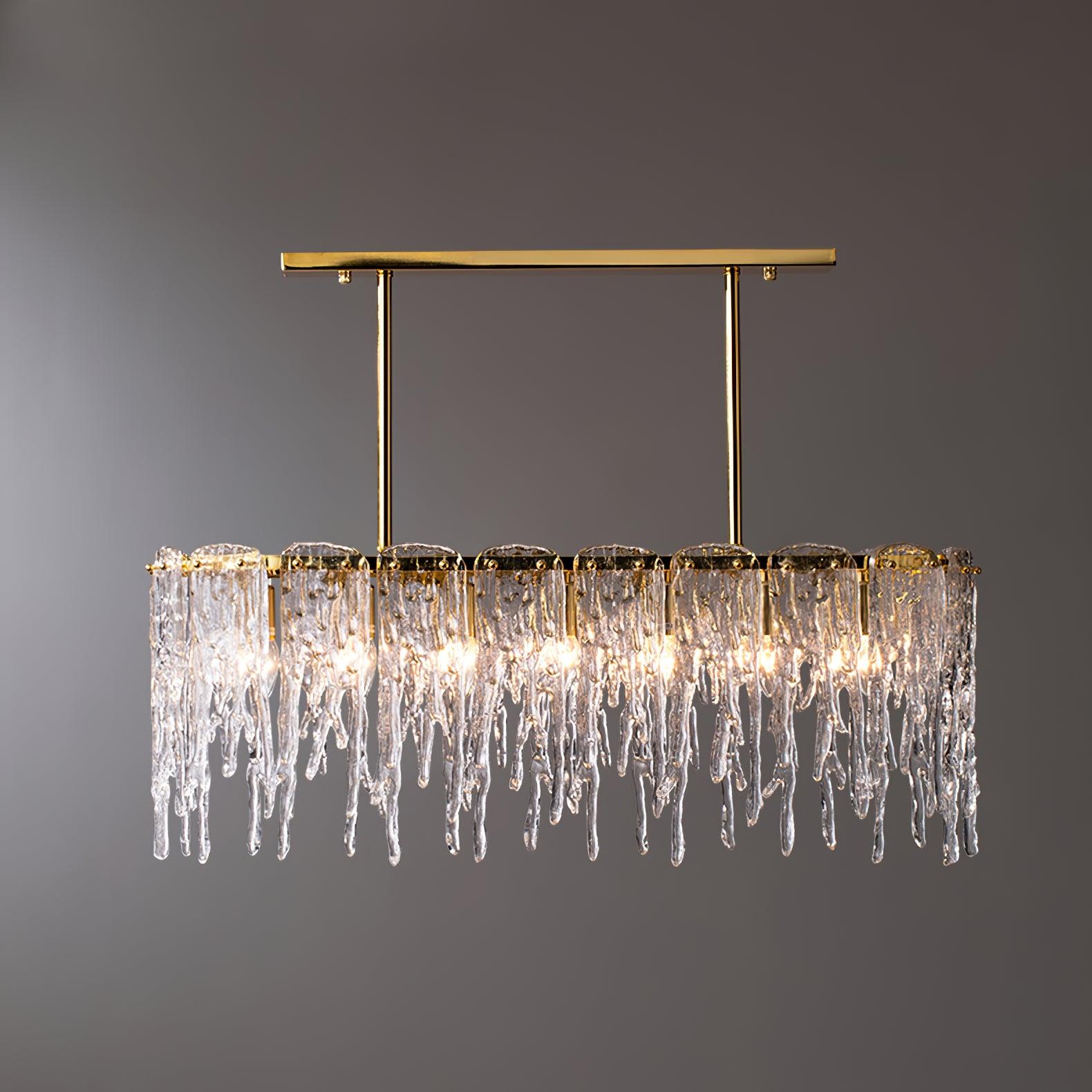 For innovative elegance and simple sophistication in a lighting fixture. this Rectangular Icicle Glass Chandelier carries as much class as any chandelier. but with a contemporary influence that enhances its style and versatility. Showcasing an array of exquisite crystals decorated around a gold. ring-shaped frame.Once on. hidden LED lights radiate through the crystals for a stunning. shimmering ambiance. A low-profile piece that never fails to create an appetizing sparkle in any living room. dining area. bedroom or office space.