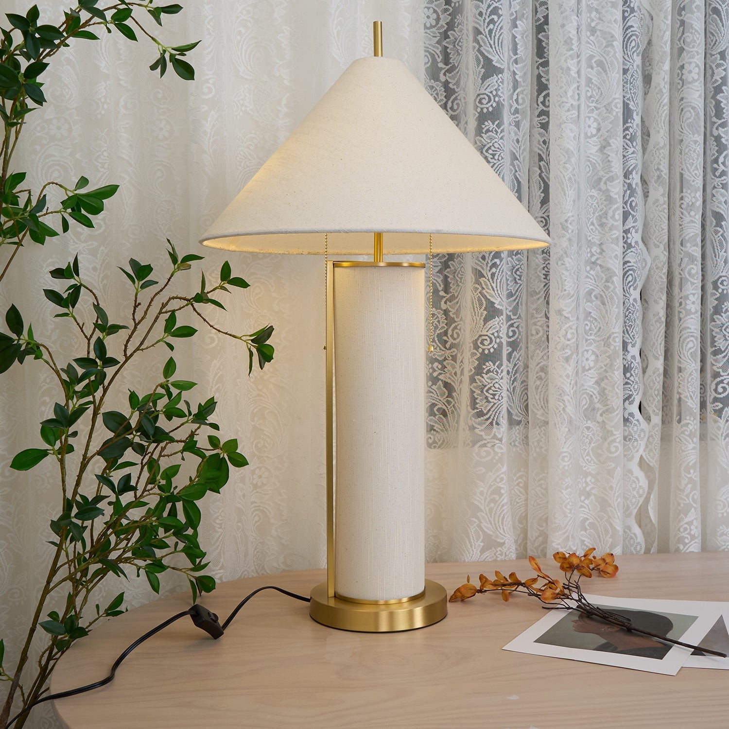 Elevate any living space with the Remi Linen Table Lamp by Vakkerlight. This natural linen lamp features warm gold accents and texture. adding a touch of luxury to any room. Paired with a matching lampshade. it brings both texture and softness to your decor.
