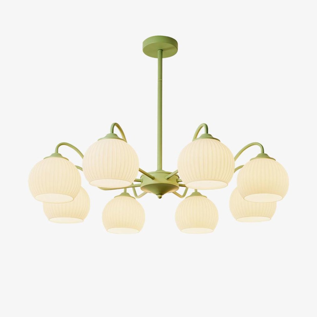 This Ribbed Glass Matcha Chandelier provides a light and airy atmosphere. The ribbed glass lampshade creates a unique visual effect. and its milky. creamy color gives off a refreshing. minimalist aesthetic. With its branch-like shape. this chandelier adds elegance to any room.