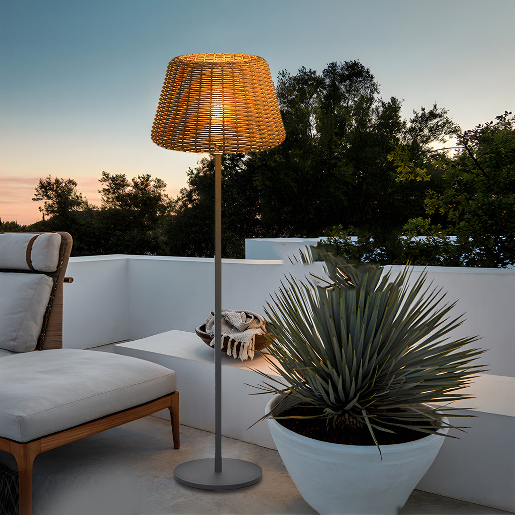 Evoke a poolside sunset or accent a evening drink with this natural rattan floor lamp. It shows off a open top hand-woven rattan shade with a drum profile and a stable black metal stem. The LED light casts captivating light and shadow around it through the hollow rattan lampshade. Its round base features an classic black metal finish to complement its slender. textured column.