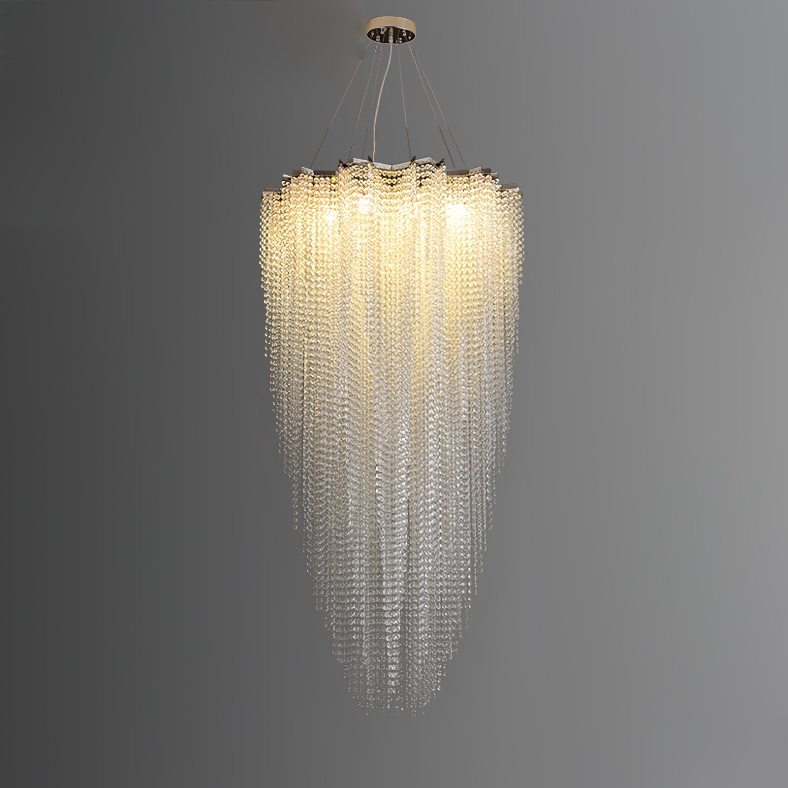 The Stalizi Crystal chandelier features a stunning cascading waterfall of crystal chains. offering a luxurious and dynamic aesthetic. Its cloud-shaped frame adds a touch of elegant curves. while the soft and mesmerizing light creates a dazzling array. Perfect for high-ceilinged areas. from staircases to dining rooms. and commercial spaces.