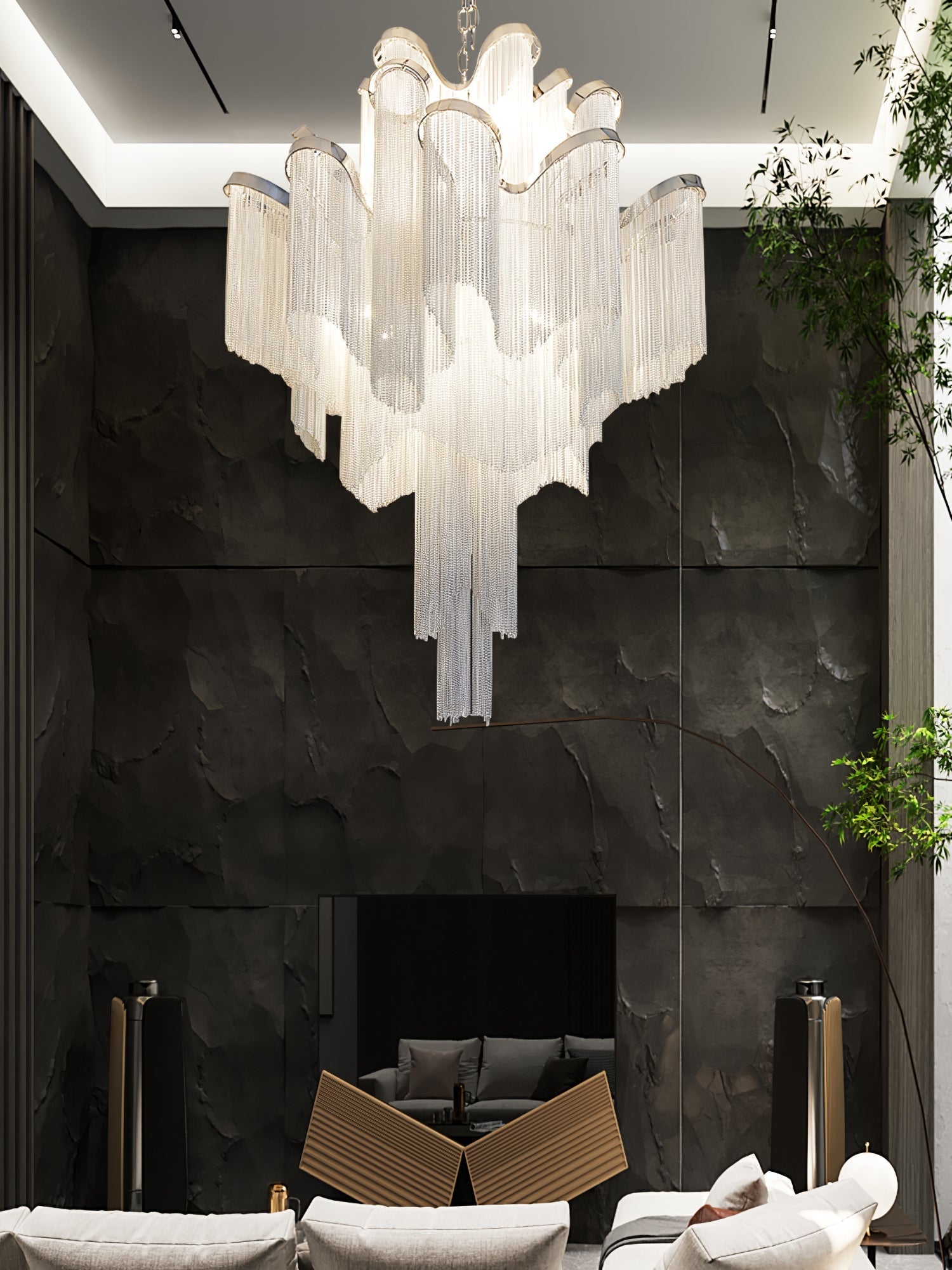 Stream is impressive in any room. Stream's design exploits the physical properties of materials to wrap the room in a unique. immersive light. Here. more than seven centimeters of metal chain seem to flow down the undulating nickel-plated frame. These cascading layers cast a striped and serene shadow throughout the room.