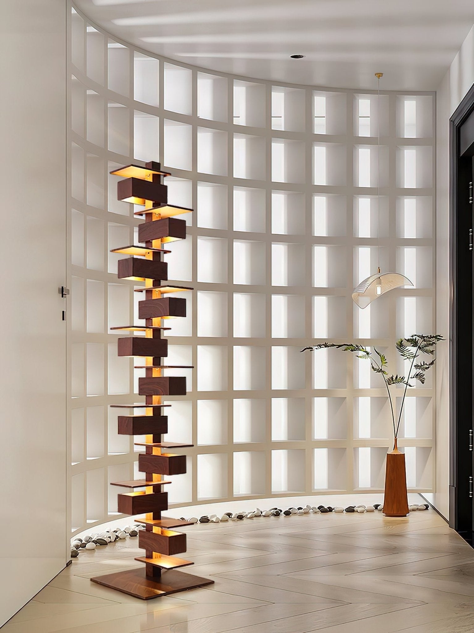 Introducing the Taliesin Floor Lamp. a unique lighting solution that combines elegance and function. Its stacked solid wood boxes create a tower-like design. emitting a warm and subtle glow that mimics natural sunlight. Illuminate your space with this lamp and create a peaceful atmosphere.