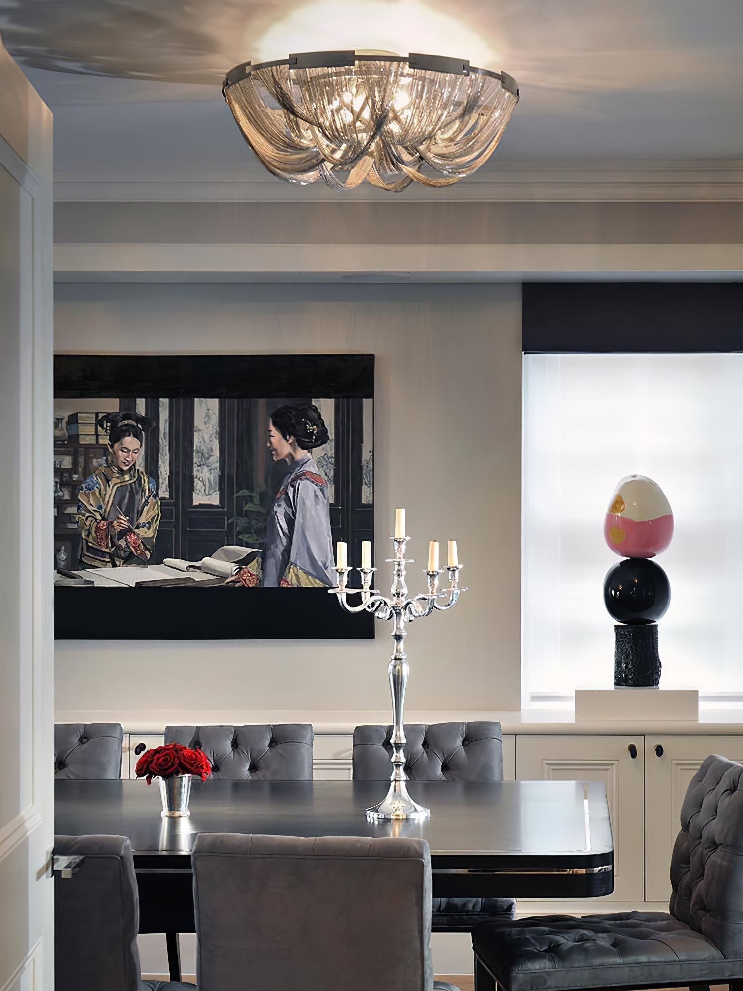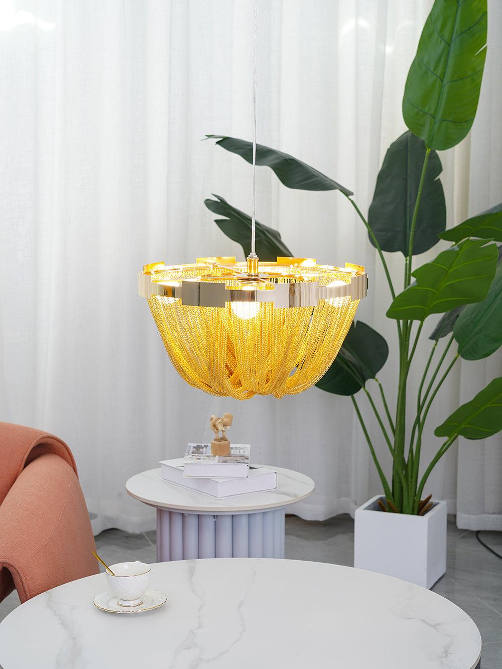 Tassel Aluminum Chain continues to reinvent the classics. With Aluminum Chain. combines traditional. artisan techniques with cutting-edge technology to give the traditional chandelier a modern update. Created by interlacing a metal chain over a nickel-plated frame. Aluminum Chain creates a dramatic and romantic effect. while still being able to complement today's modern luxury.