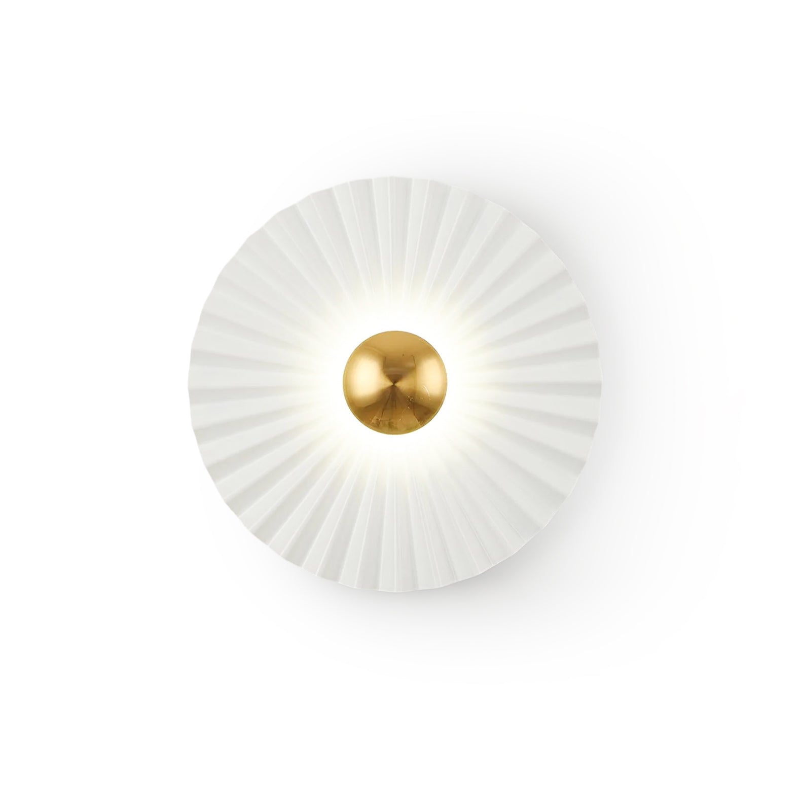 Take Tinsley for a twirl! Wrought with feminine design details. Tinsley's standout is her pleated ceramic collar. Finished in a glossy white finish. the delicate plate is accentuated by aged gold and metal.