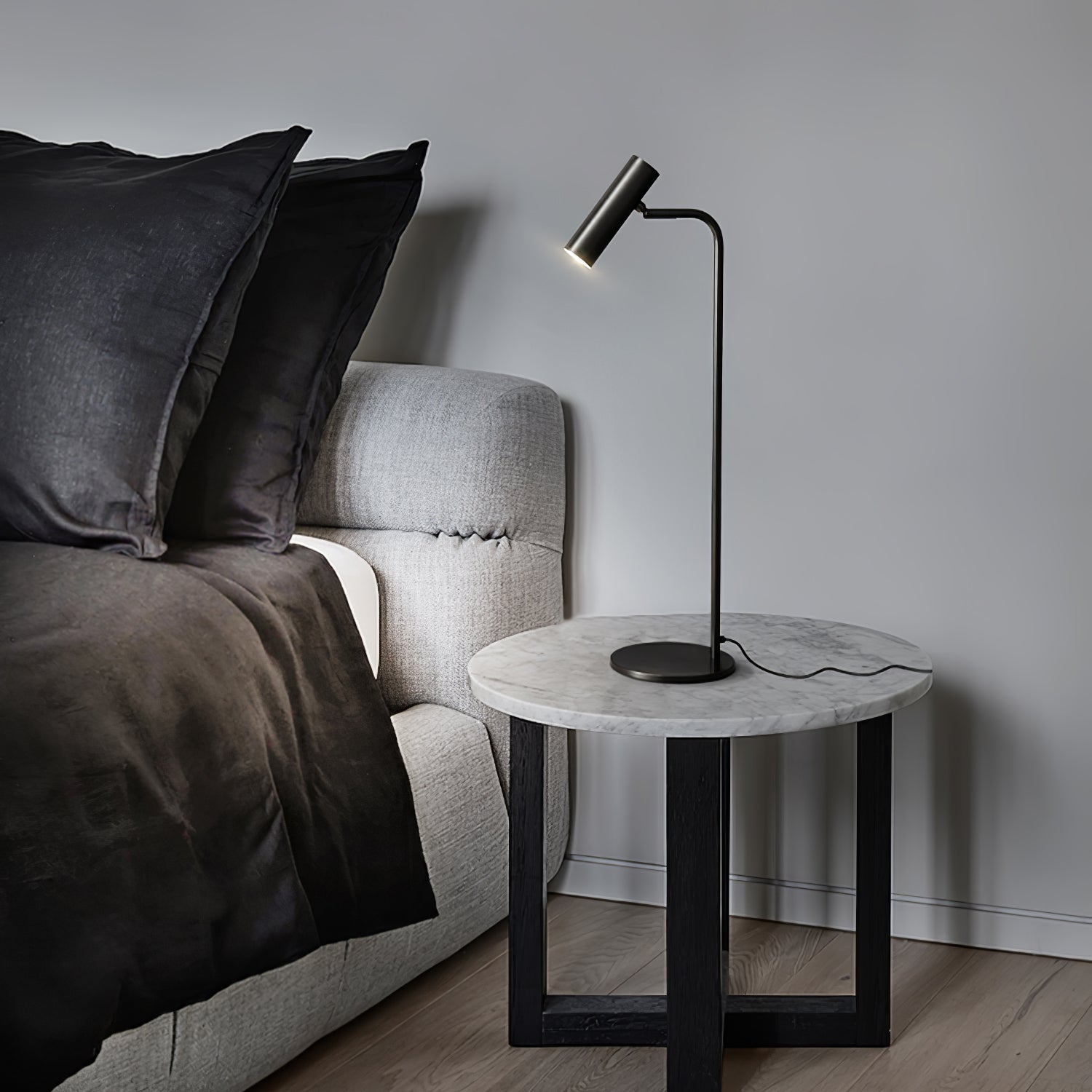 Torris Table Lamp offers a touch of subtle luxury. with a minimal design that embodies quality materials and craftsmanship. It features a slim Satin Brass body that curves to hold the adjustable cylindrical head that can be tilted to direct the light as needed. with a round Satin Brass finished table base.