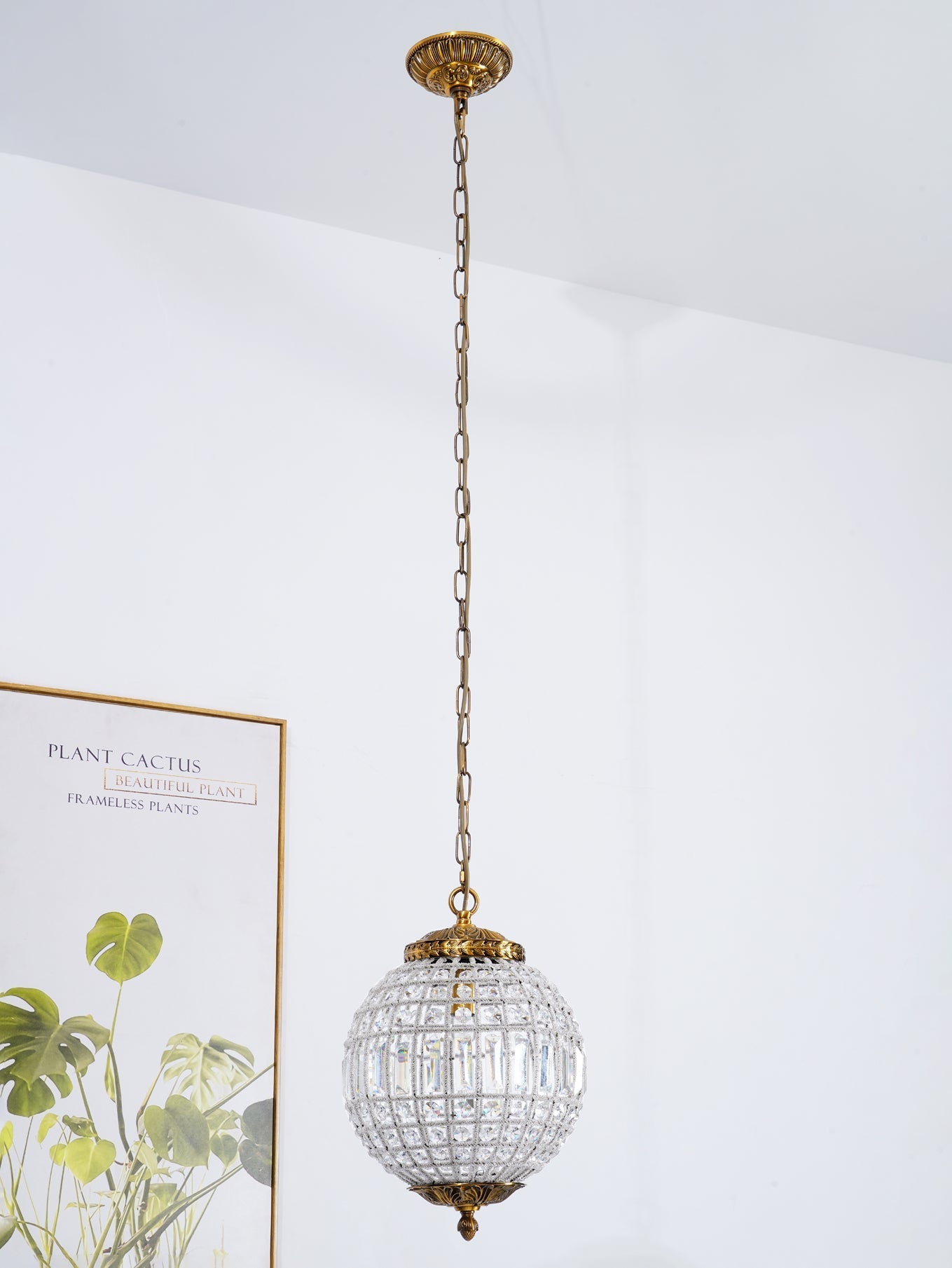 Bring brilliant style to your dining room. bedroom. or entryway with this glam single-light pendant. We love hanging this piece on its own or in multiples for a more dramatic look. It's made of metal in a gold-tone and features an adjustable chain and an ornate header with a matching bottom finial. The globe shade features a cage design. which is covered in rows of clear crystals. which glitter in the light.