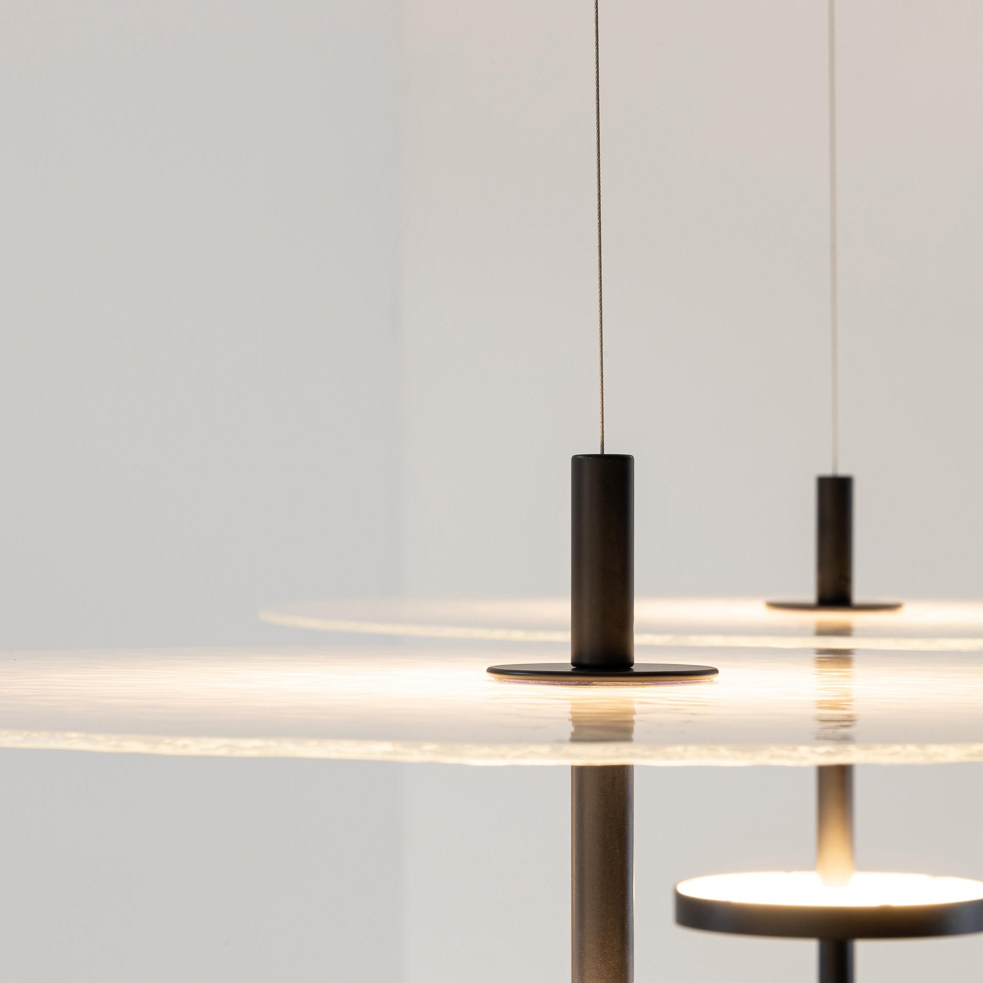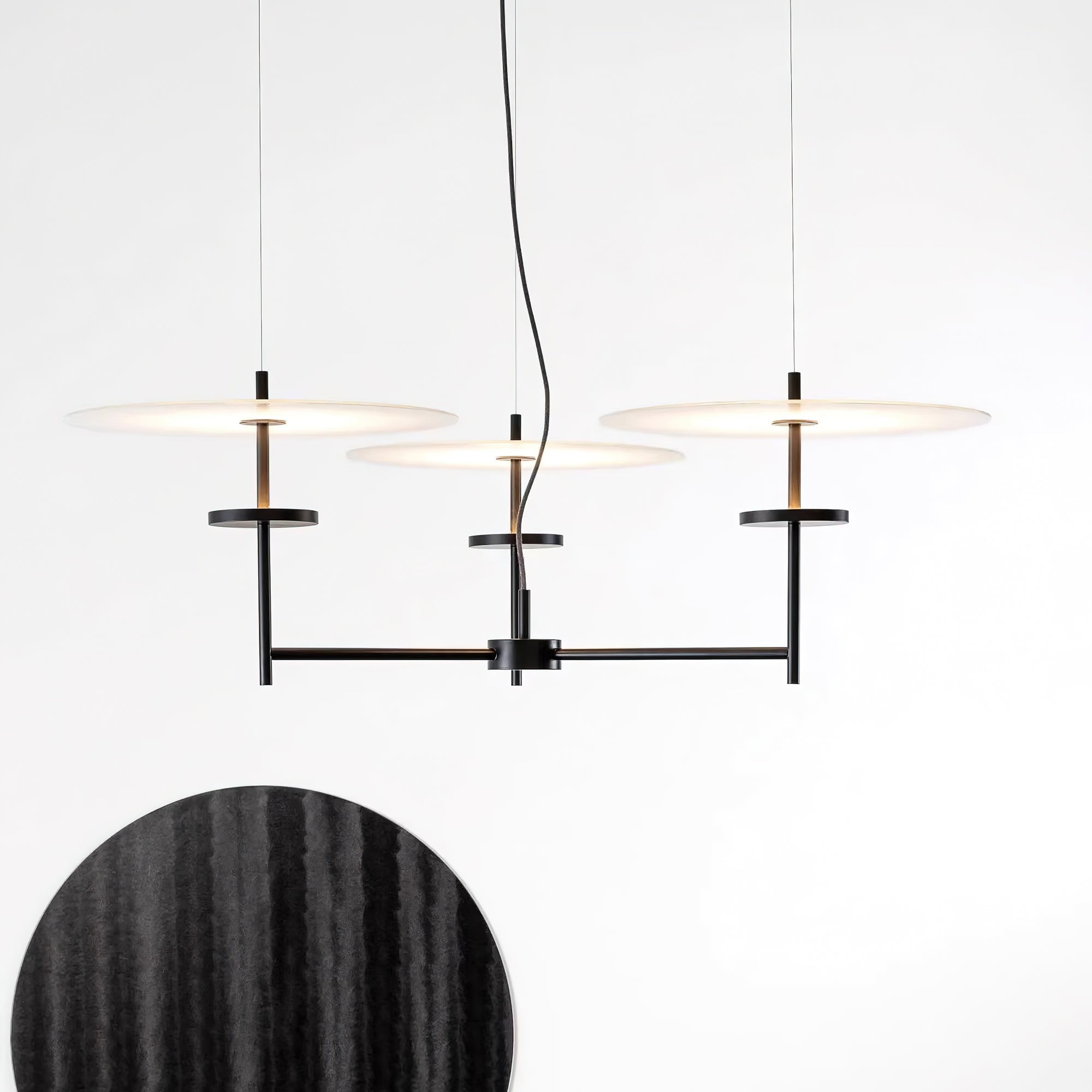 Illuminate your space with the Trezzero Chandelier. The disk-shaped lampshade mimics a solar eclipse. providing a unique and artistic touch. The sleek black brackets and warm lighting bring balance and beauty to modern spaces. Bring the beauty of light and shadow to your home with this stunning chandelier.