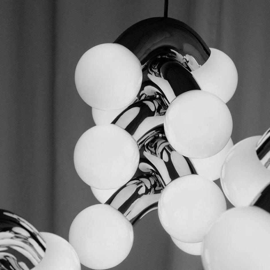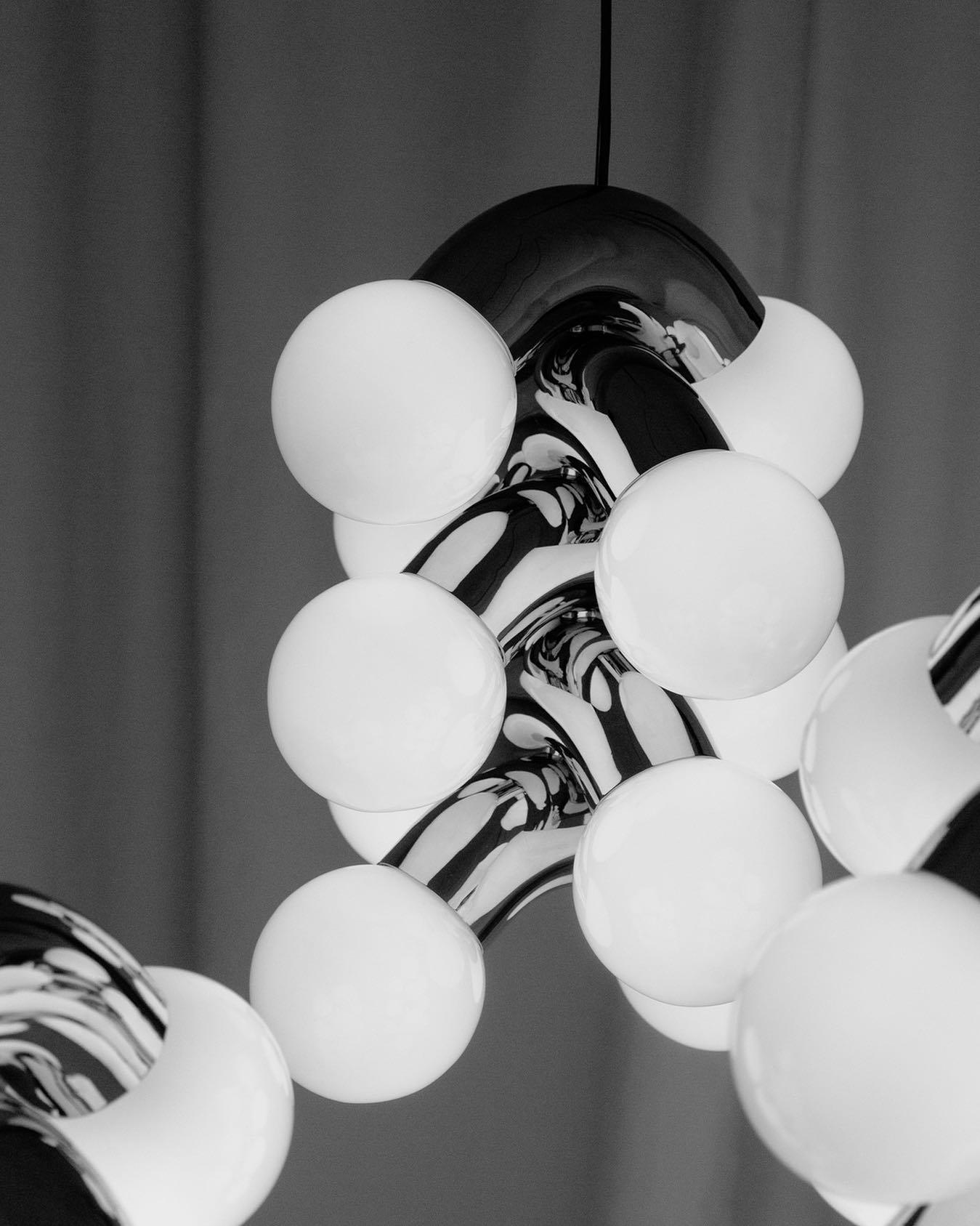 The Vine series introduces exaggerated form with propensity for repetition resulting in a bold impact. Composed of a poised chrome arc flanked by two glowing glass globes—the multiplication of the module enables the fixture to grow. exponentially overstating the fixture's overall silhouette.