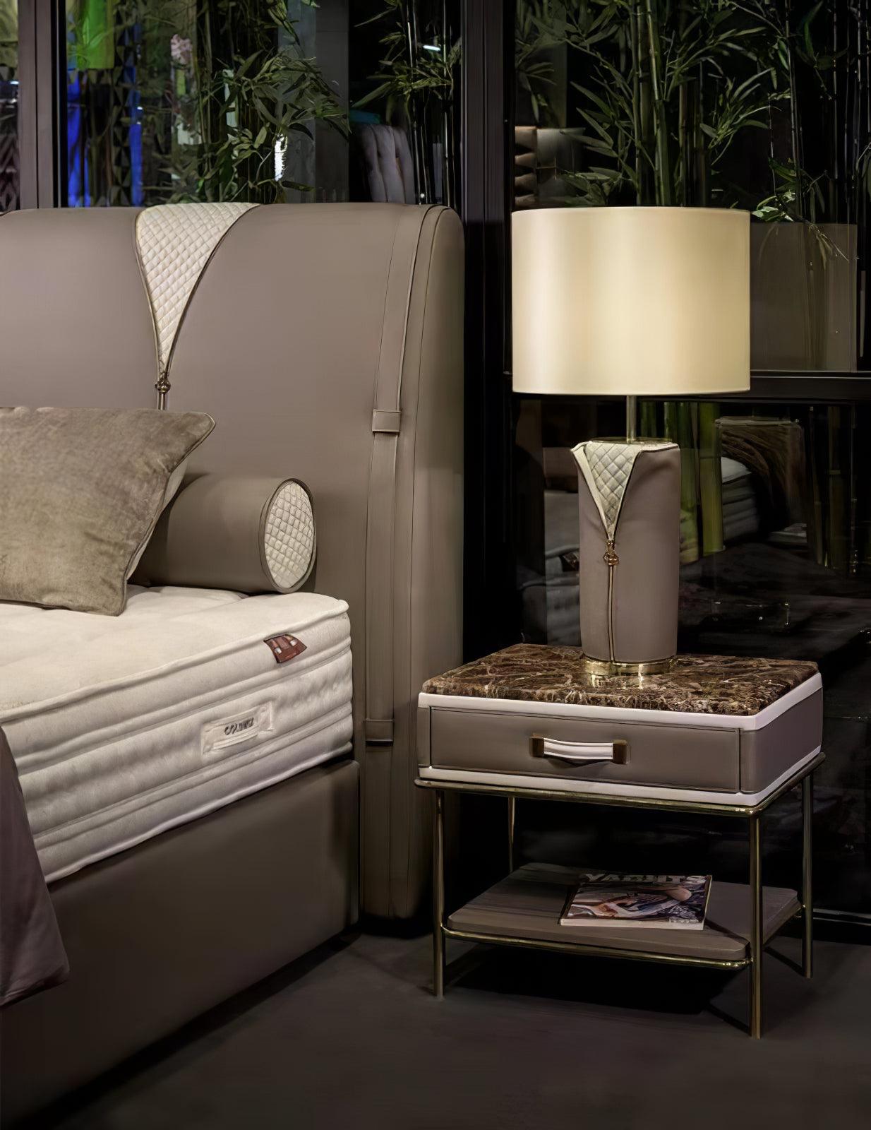 The contemporary Bromyard table lamp has a white shade that highlights the mixed materials of the body: a metal base and a gray leather finish with a bright slotted gold neck. Bring stylish illumination to any family room or living room with this gray table lamp.