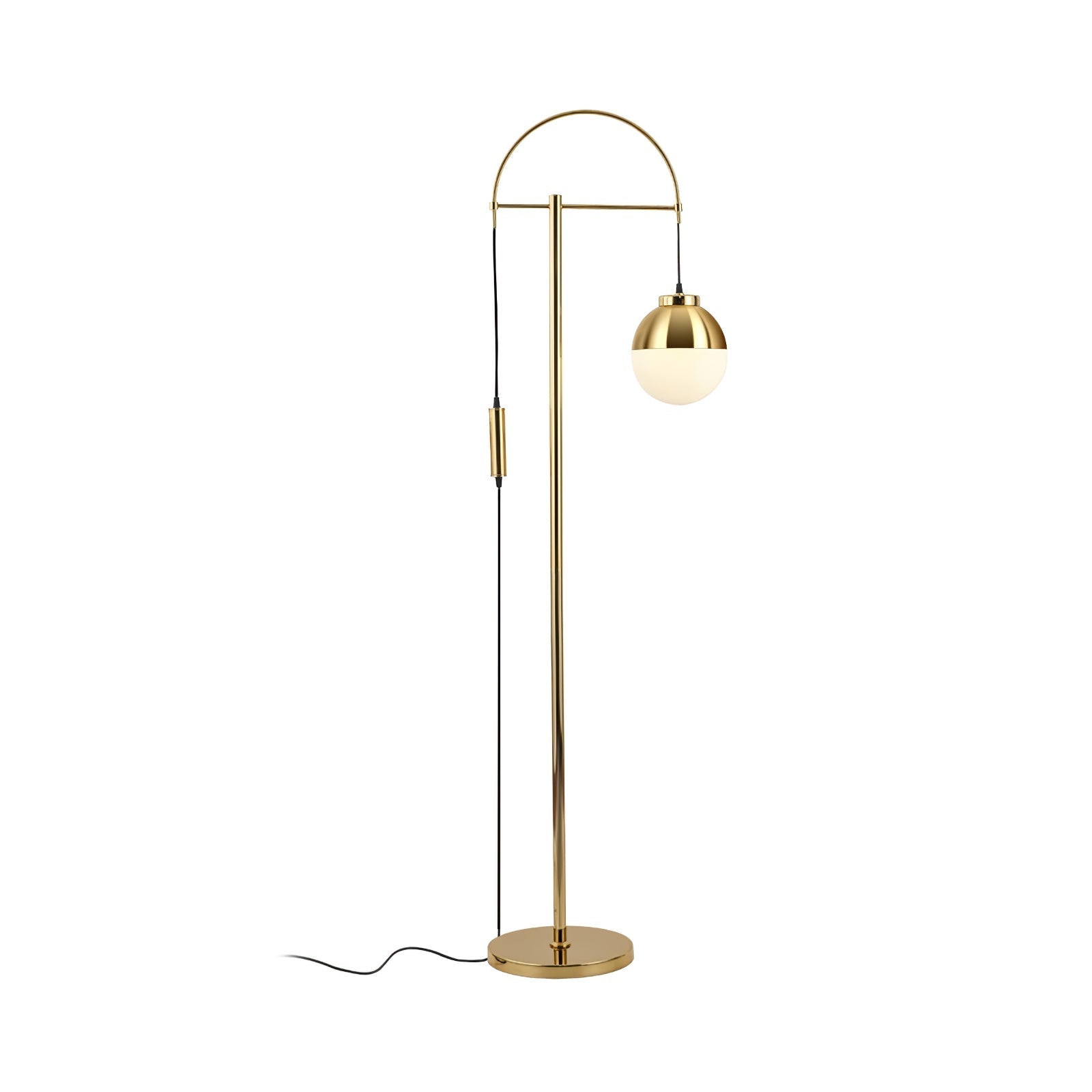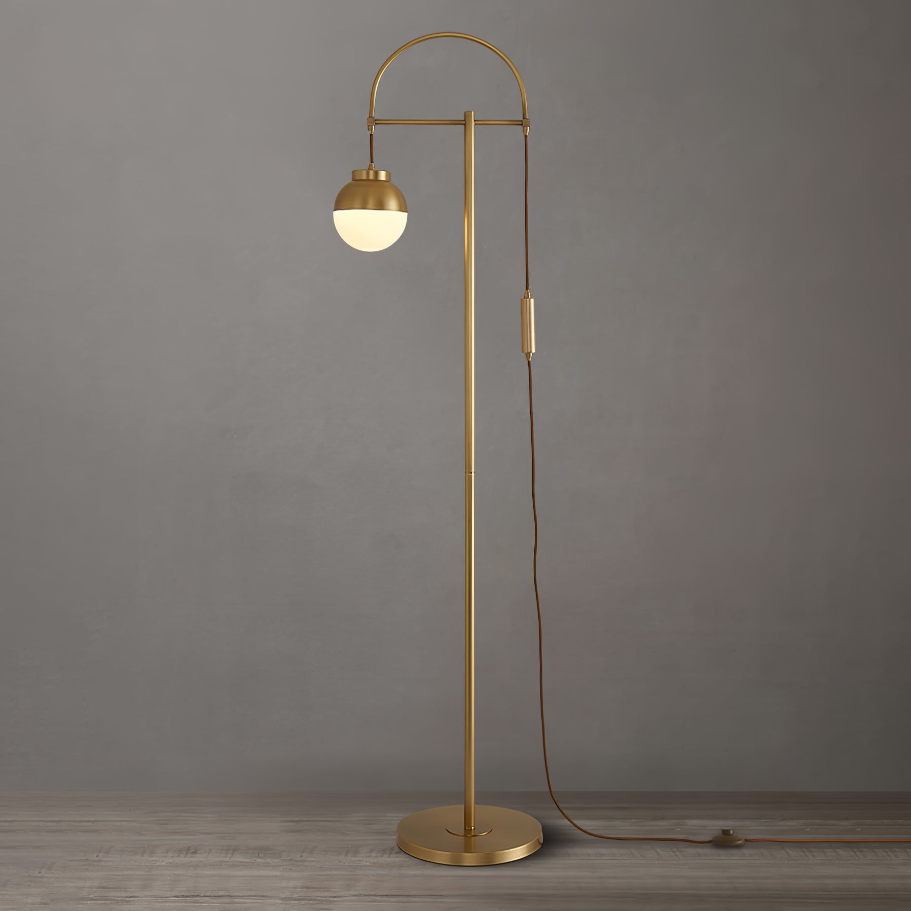 This posh arc floor lamp with its iconic mid-century sensibility will set a modern mood wherever you place it. Frosted glass sphere combines with soft. brushed brass to double-down on contemporary design.