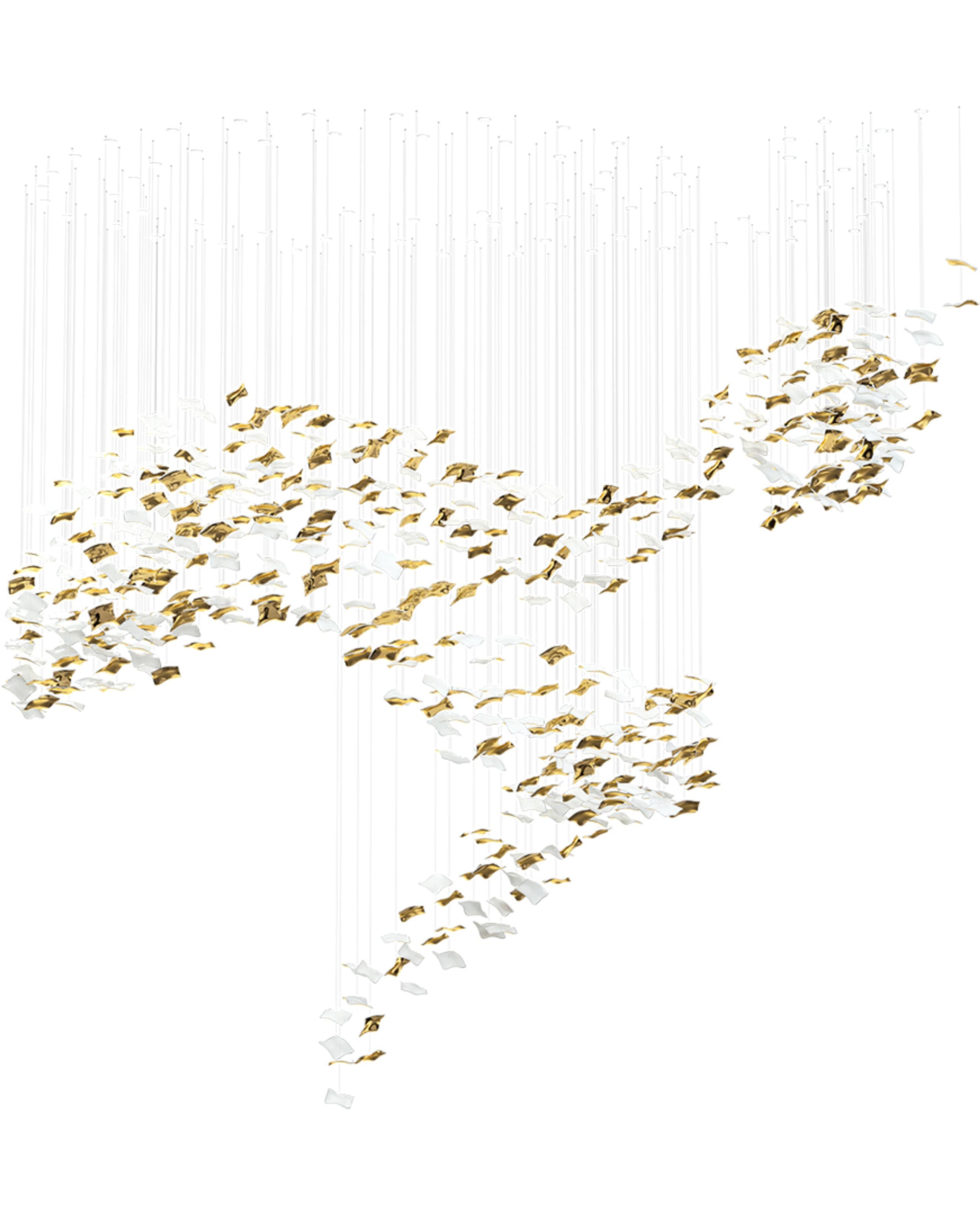 The Whispering Kerchiefs Collection captures the delicate beauty of kerchiefs caught in a gentle breeze. effortlessly elevating your decor with a touch of elegance. Each hand-blown opal glass piece floats gracefully. creating a sense of lightness that enchants any space. The contrasting metal finish adds a bold accent. enhancing the refined aesthetic of the design. Perfect as a captivating focal point. the Whispering Kerchiefs Collection brings a stylish and sophisticated ambiance. transforming interiors with its graceful form and artful craftsmanship.