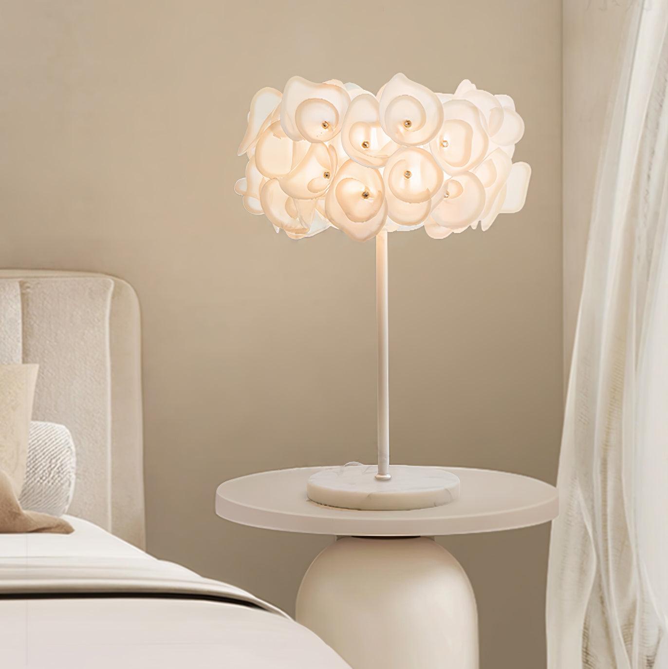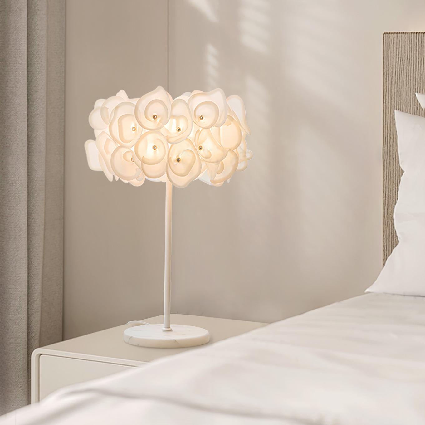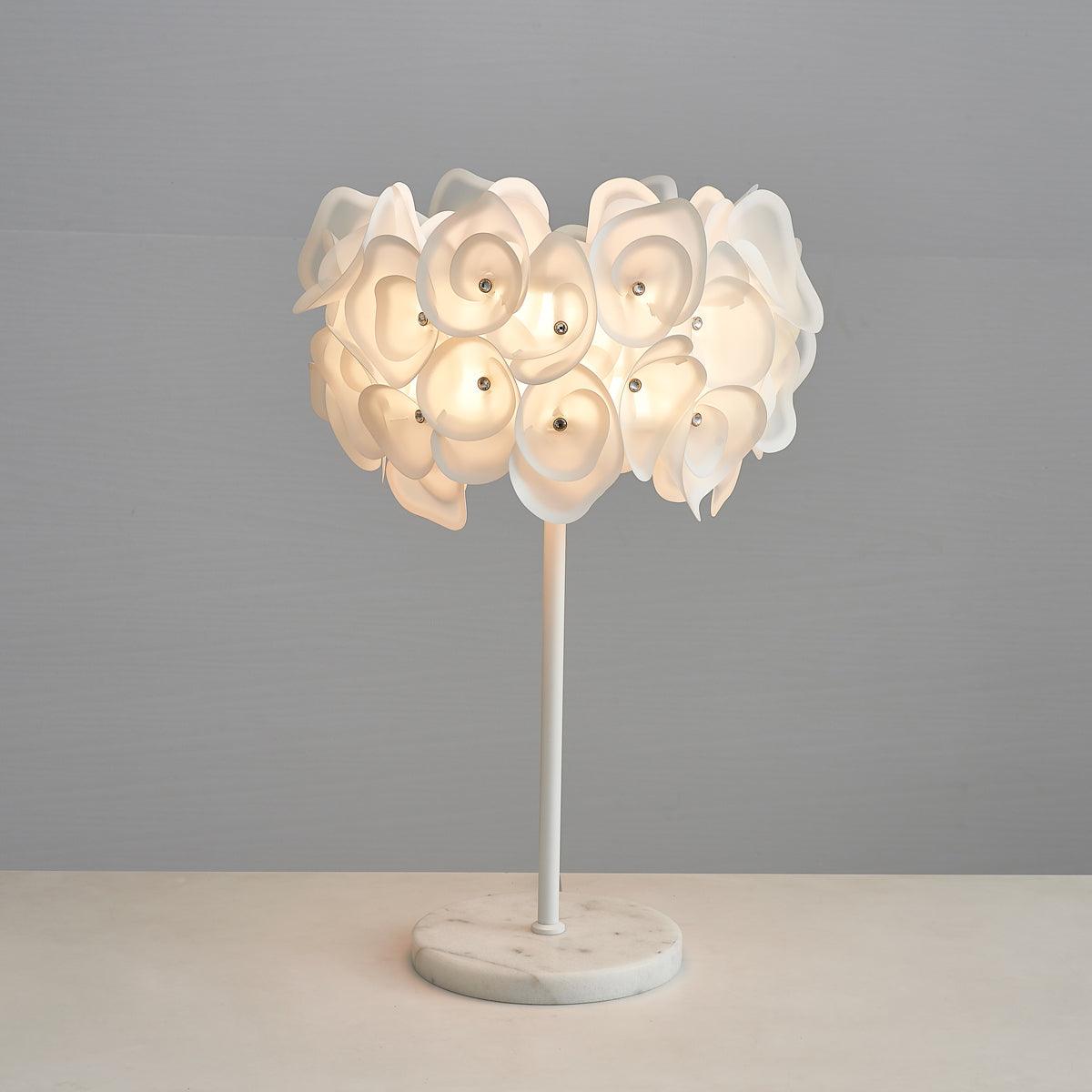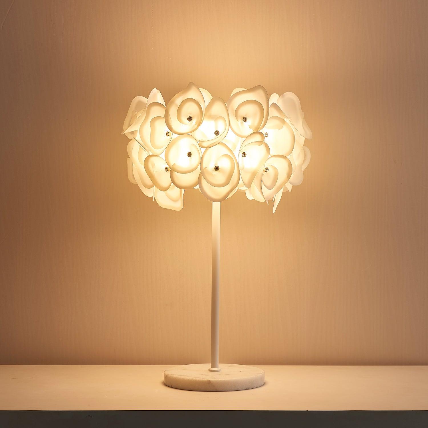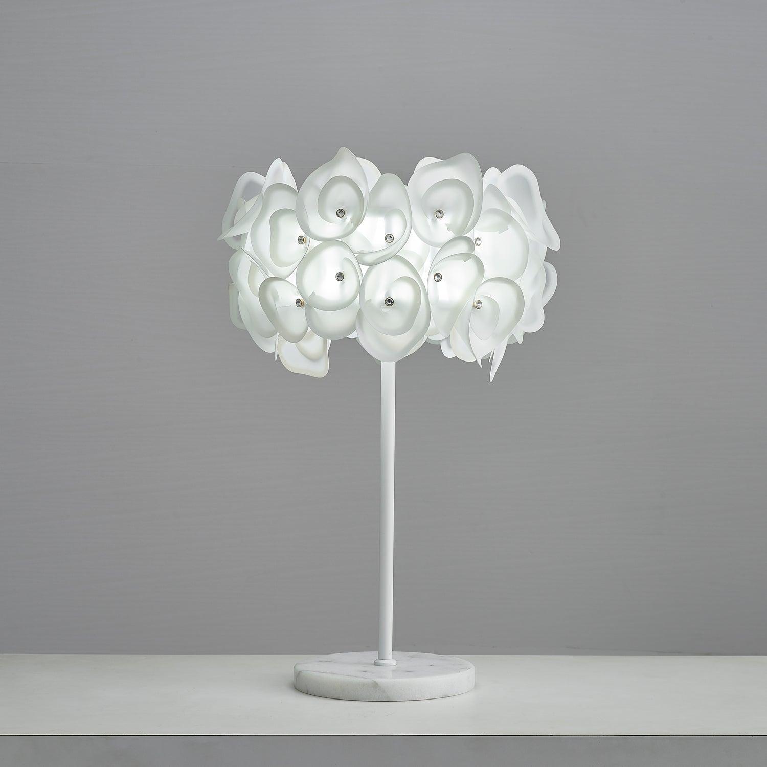 The White Hydrangea Table Lamp is an eye-catching piece of art. with its smooth lines. intricate silhouettes. and stunning looks. Its cloud-like design is made up of individual petals that are hand-bent and cold-cut. giving it an exciting. lively feel. With many shapes combined. it creates a beautiful light diffusion to draw attention. making it a conversation starter.