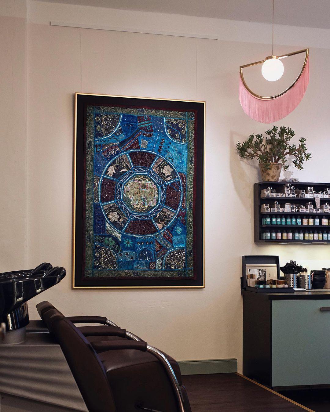 Such a precious jewel. the fringes elegantly adorn the golden metal geometric structure. The rigidity of the rainbow serves as a contradiction to the fragility and delicateness of the fringes. This silky and light curtain gently twirls under the effect of the air currents... Wink draws both the eye and the hand: you want to caress and run your hands through it. slipping them inside this waterfall of wools that are warm to the touch. The bulb is housed in a delicate white glass globe.