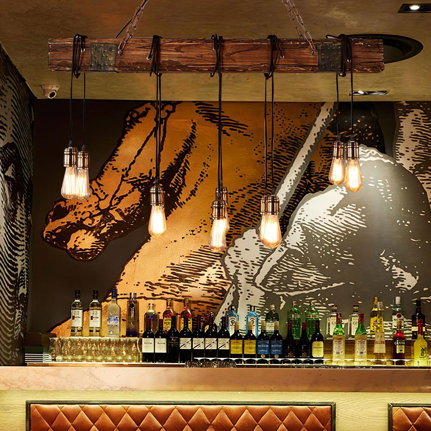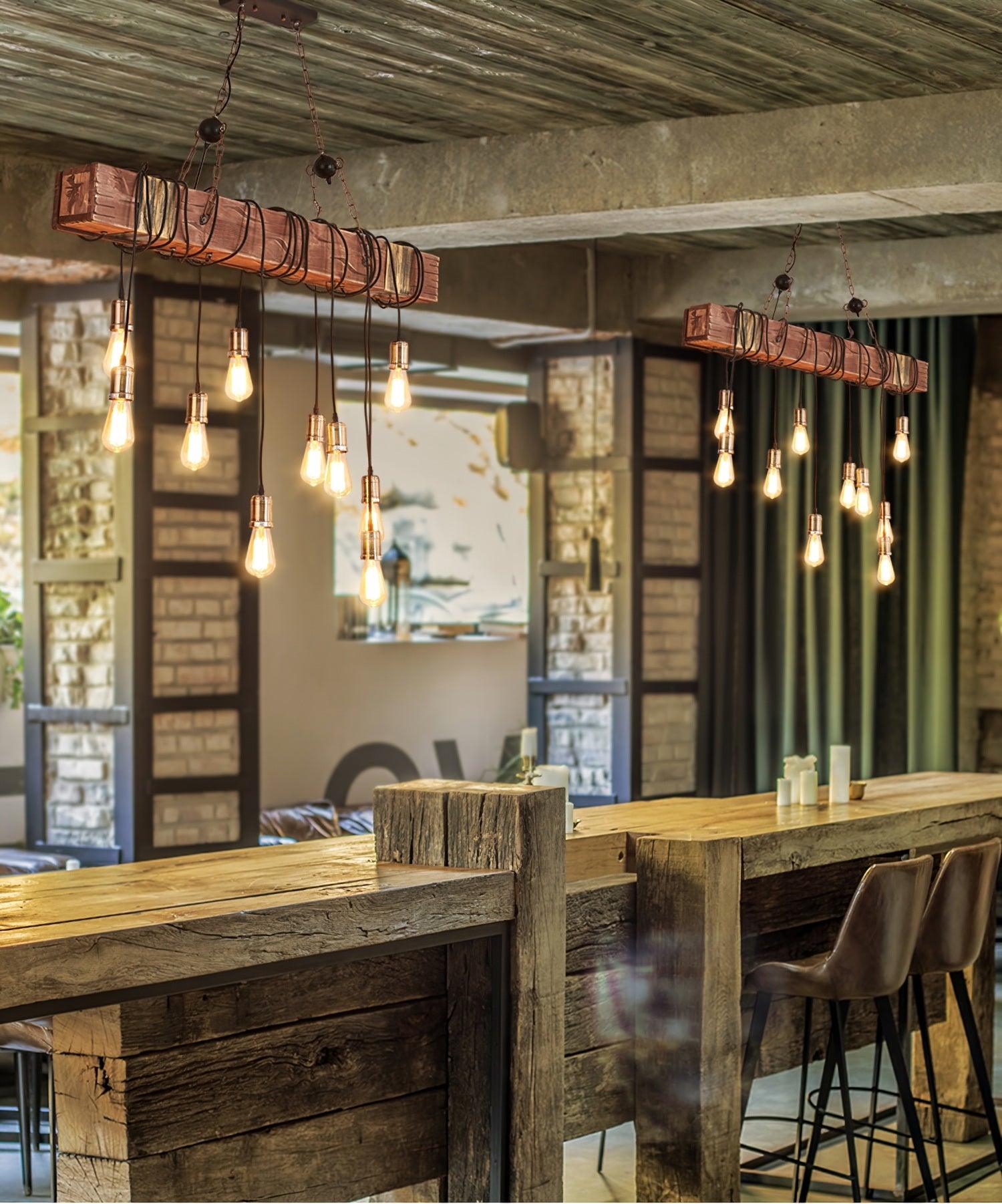 Creating a sense of pristine elegance to home interior with this 10-light island pendant light. Reminiscent Edison bulbs wrapping around the dark reclaimed wood beam creates this masterpiece. Rust round iron balls with chains attach the light fixture to rectangular canopy. adding handsome sophistication and elegance to this design. Over a kitchen island. dining table and pool table or in a living room. it will lend that farmhouse charisma and rustic style.